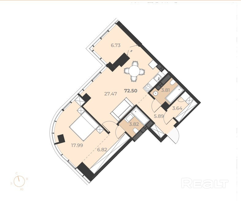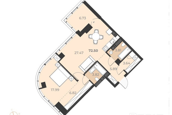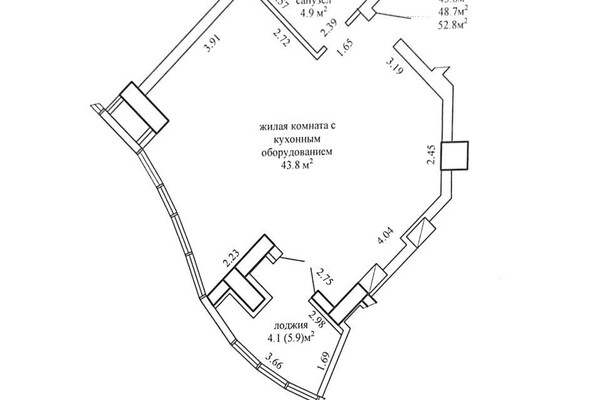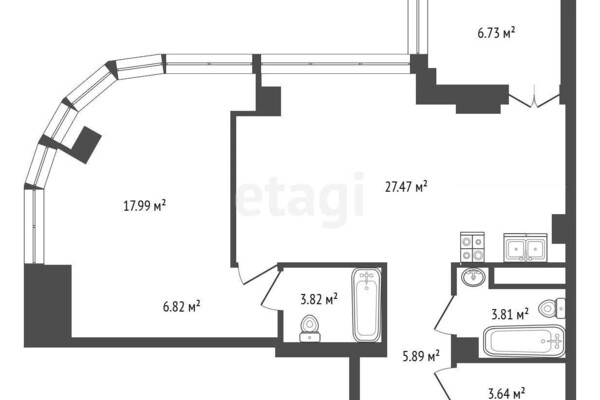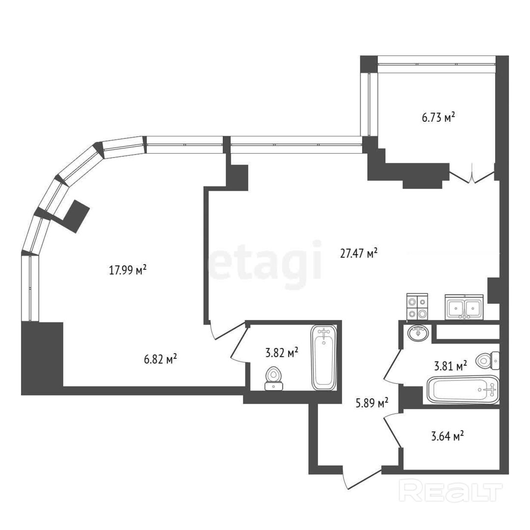 В продаже есть квартира и чуть просторнее. Жилье площадью 76 квадратных метров расположено на 15-м этаже и имеет свободную планировку. На фото в объявлении, кстати, представлен один из вариантов установки перегородок. Цена квартиры — 792 тысяч рублей, или 270 тысяч долларов (10 394 рубля = 3539 долларов за метр).