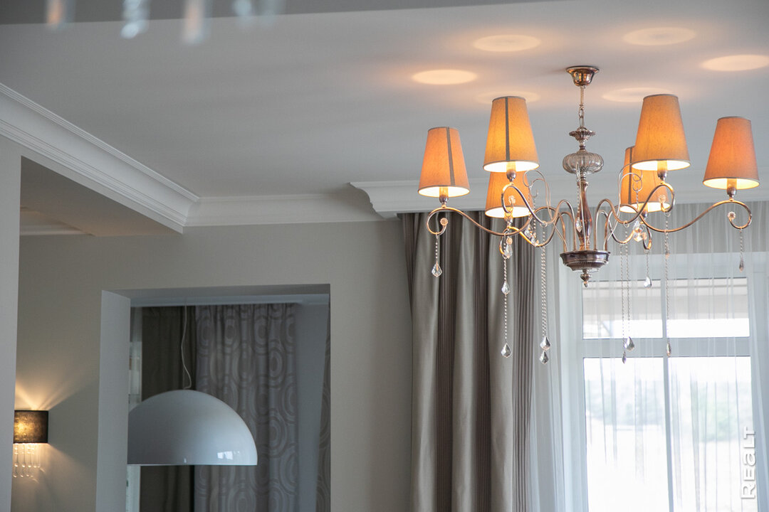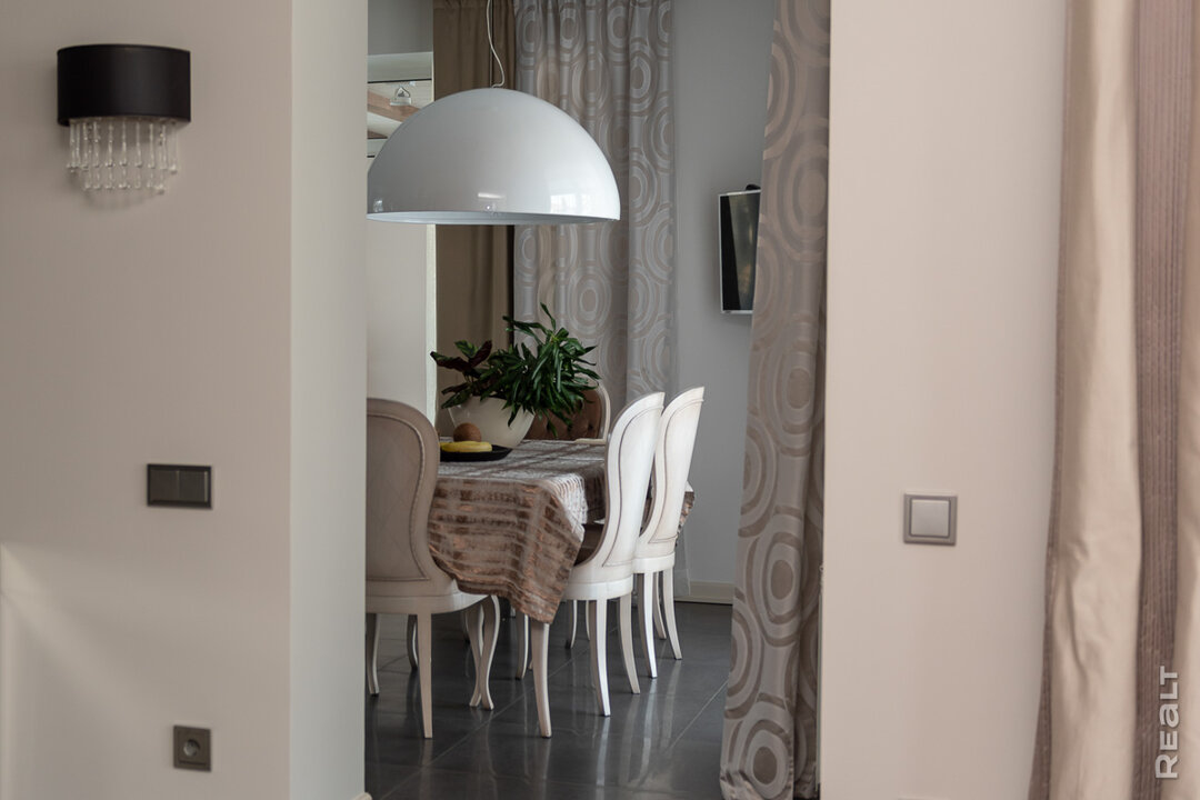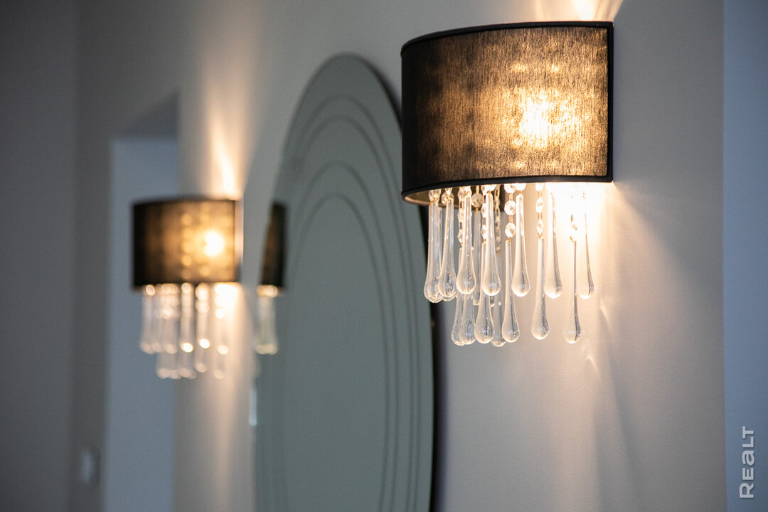 Заметно, что владелица много внимания уделила и подбору люстр, светильников — все они с уникальным дизайном и своей маленькой историей. Вот, например, огромная белая люстра над обеденным столом. Она отлита из тонкостенного гипса, снаружи покрыта глазурью, а внутри — лепной природный узор.