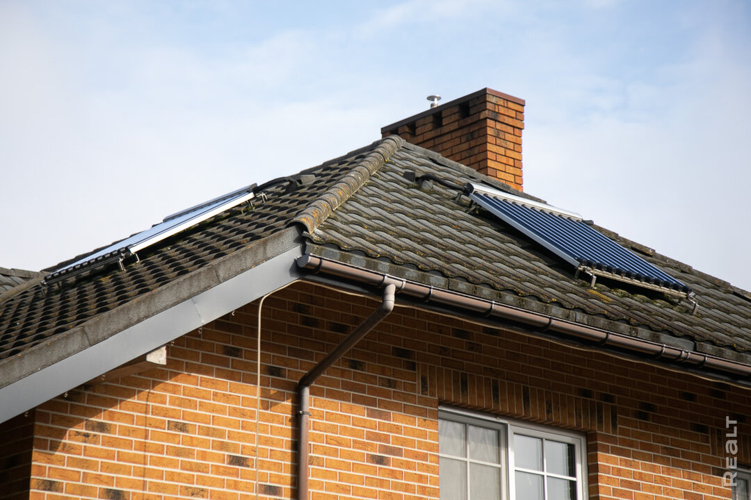 Еще одно рациональное решение — композитная металлочерепица на крыше: выглядит как натуральная, не шумит во время дождя, гарантия производителя 30 лет, а срок службы еще дольше. На крыше, кстати, установлены два солнечных коллектора — для подогрева воды.