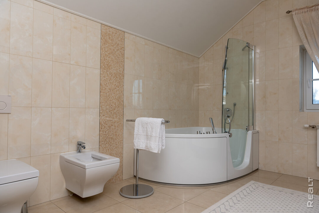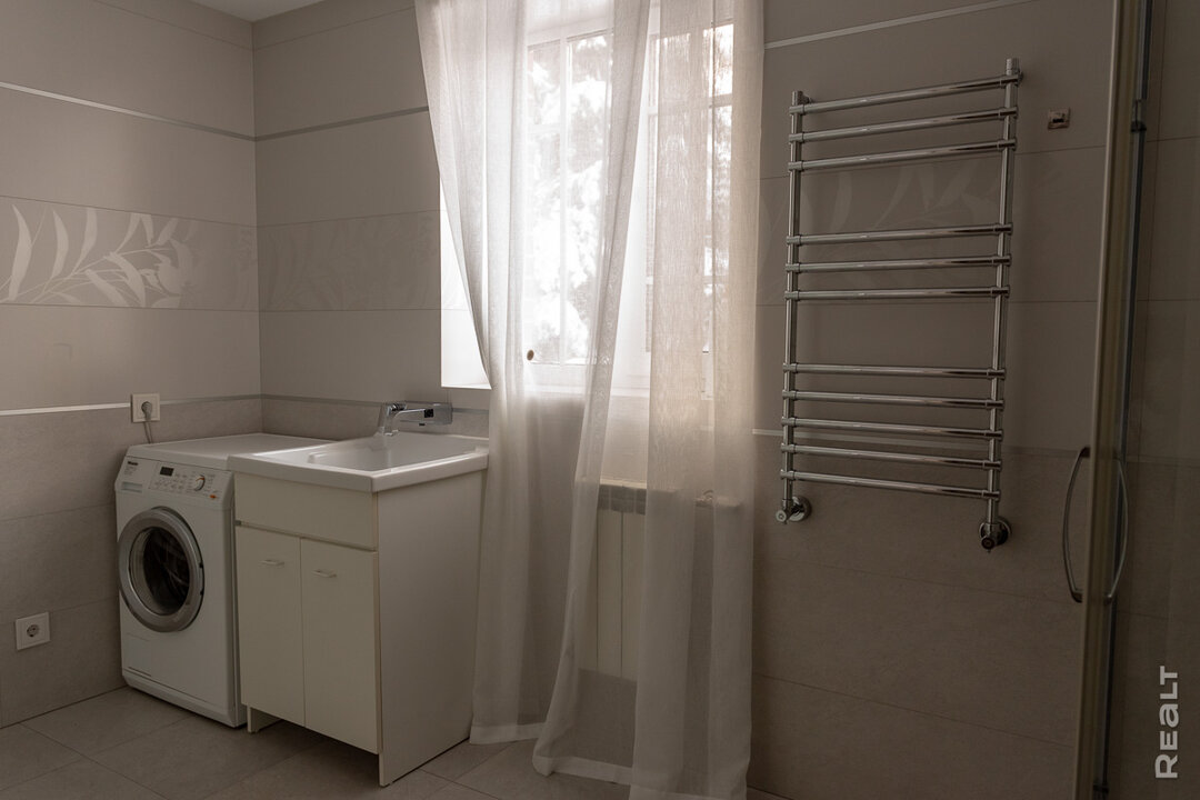 Технические помещения расположены в правой части первого этажа: большой общий санузел, топочная с отдельным выходом во двор (специалистам по обслуживанию инженерного оборудования нет необходимости заходить в остальные помещения дома). Отопление газовое с погодозависимой автоматикой. Вода в дом подается из собственной скважины, предварительно пройдя через систему фильтрации и умягчения.