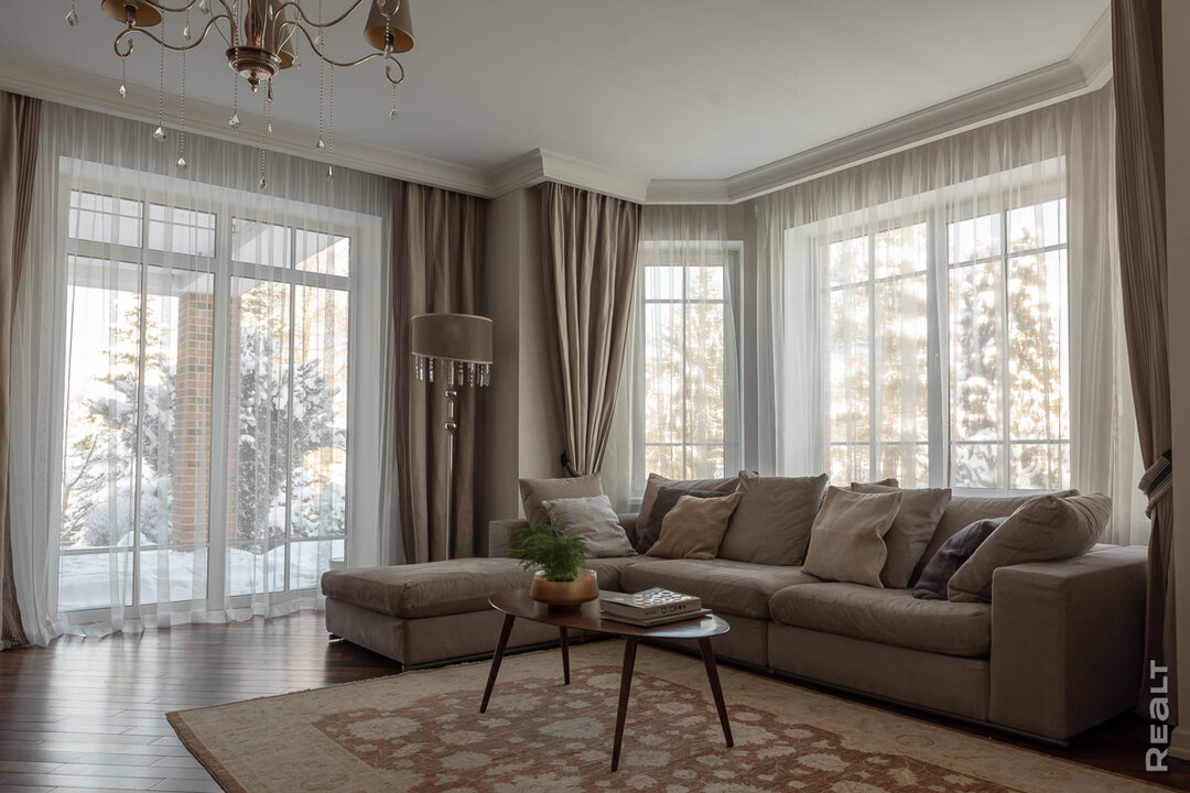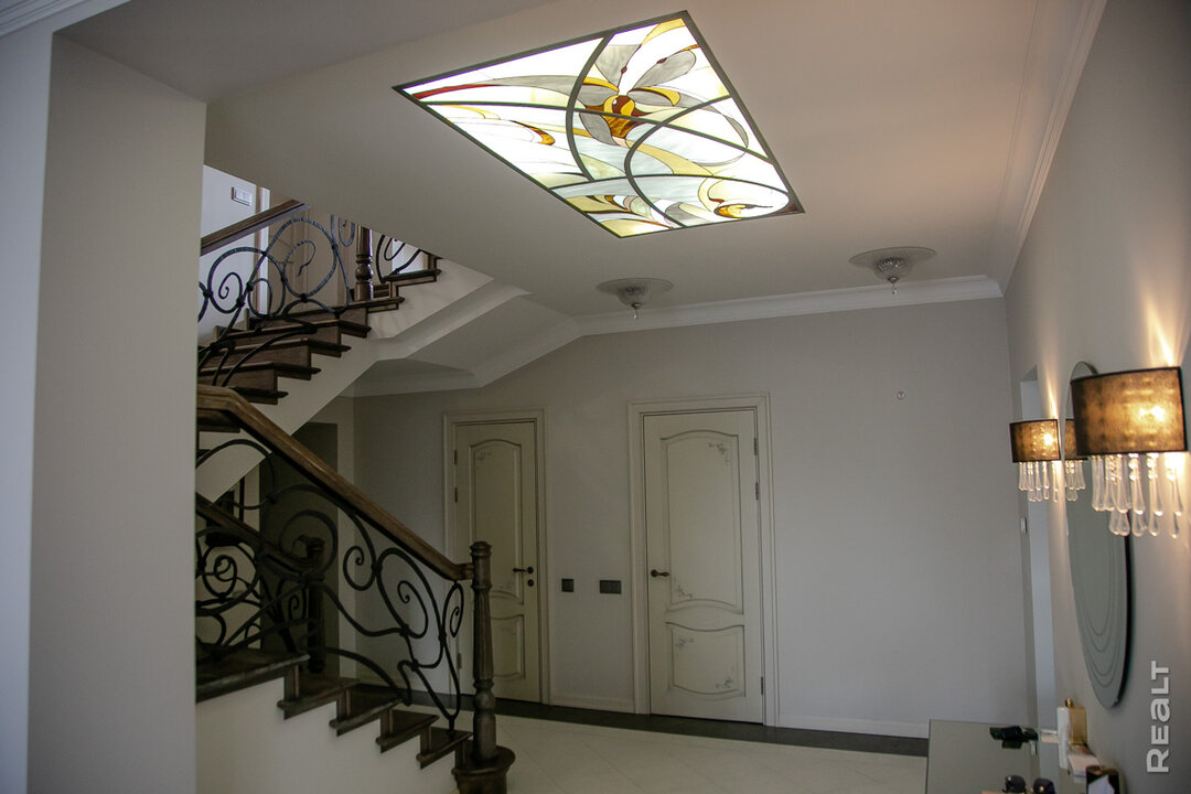 Интерьер дома — современная классика, которую хозяйка создавала сама, советуясь с дизайнерами. Интерьер соткан из множества деталей, каждая из которых — часть мозаики, в которой нет лишнего и бесполезного. Материалы отделки подбирались соответствующие классу. Например, пол на первом этаже из палисандра — экзотической твердой породы, которая не боится воды и со временем приобретает благородный выгоревший оттенок. На втором этаже — паркет из бамбука. Плитка во всех помещениях итальянская, дизайнерская, включая такой известный бренд, как Versace. Лестница — из массива ясеня с природным узором металлического ограждения ручной ковкой. Дизайнерские двери из теплого массива ясеня изготавливались по индивидуальному заказу. Все это задает тон и настроение всему дому.