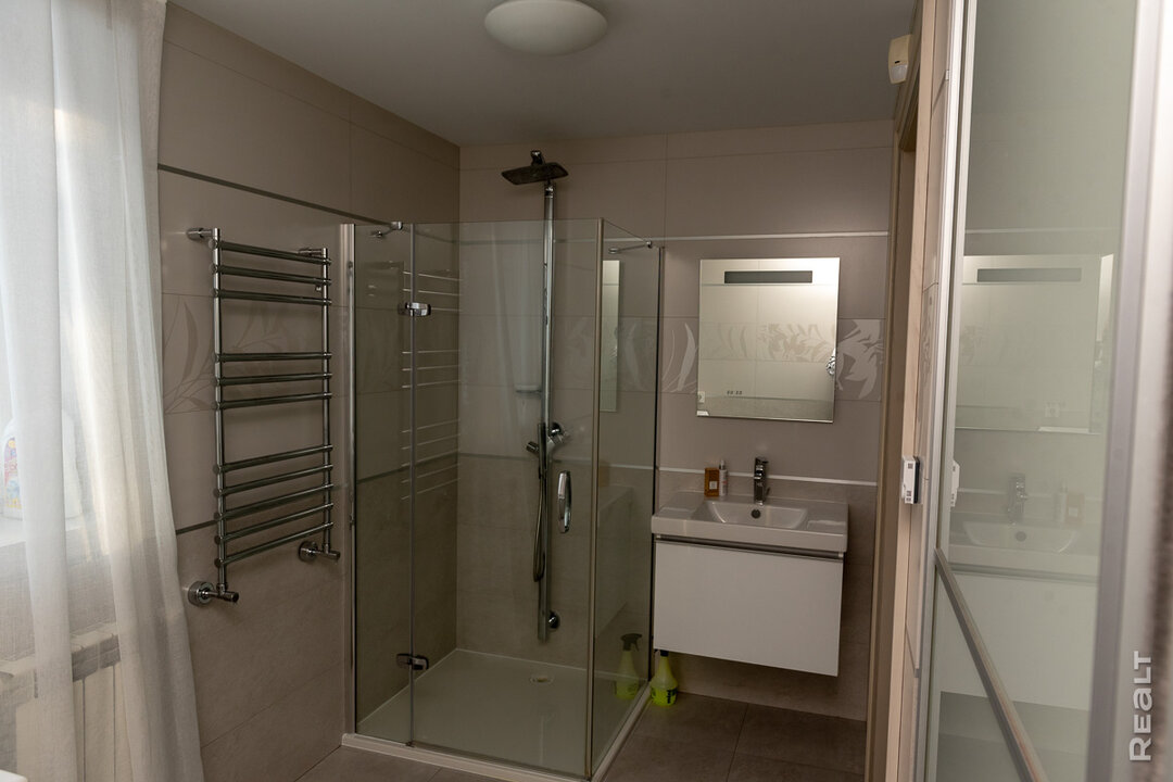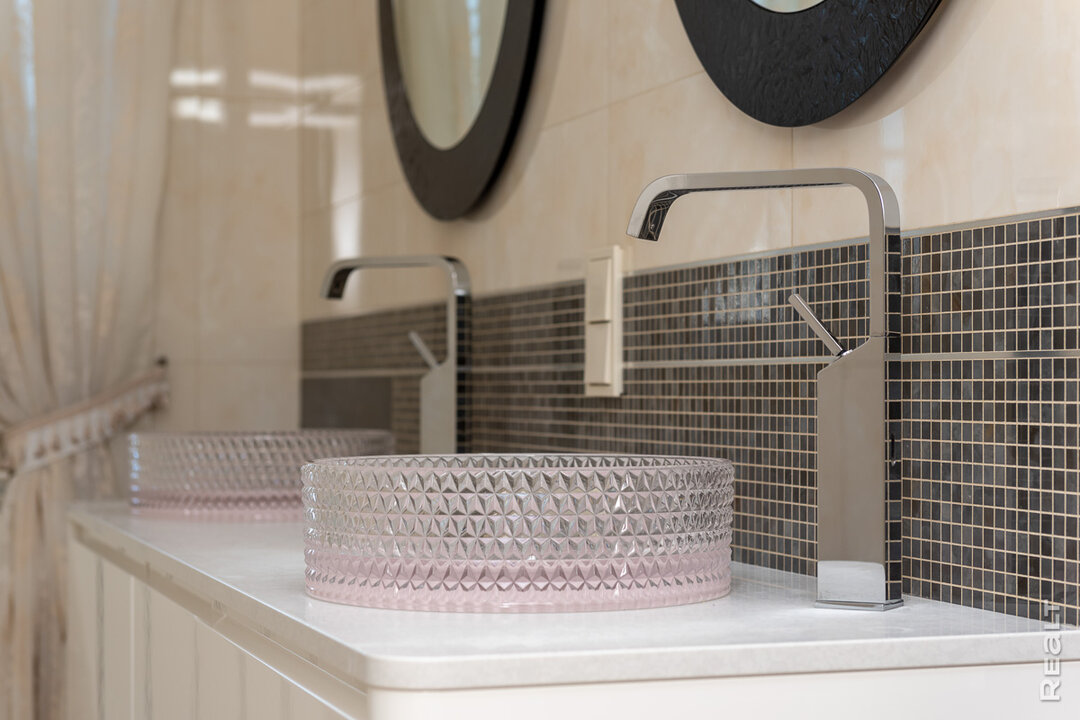 Главный сюрприз в ванной — душевая кабина-трансформер. Это глубокая кабина с герметичной дверцей: можно использовать ее как душ, не перелезая через борт, а при желании набрать воду как в полноценную ванну. Здесь же французские стеклянные умывальники, смесители разных премиум-брендов (Axor, Gissi, Grohe) — все работает безупречно. Сантехкерамика тоже премиального уровня — Villeroy Bosh, Jacob Delafon, Teuco.