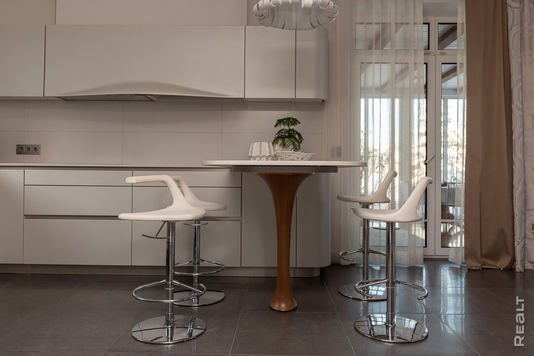 Кухню узнают поклонники итальянского дизайна — это модель Ola Classica от дизайн-студии Pininfarina — той самой, что десятилетиями сотрудничает с Ferrari. Многие годы она является иконой стиля: узнаваемый изгиб вытяжки в линиях фасада, плавные «автомобильные» линии, полуостров на скульптурной опоре.
