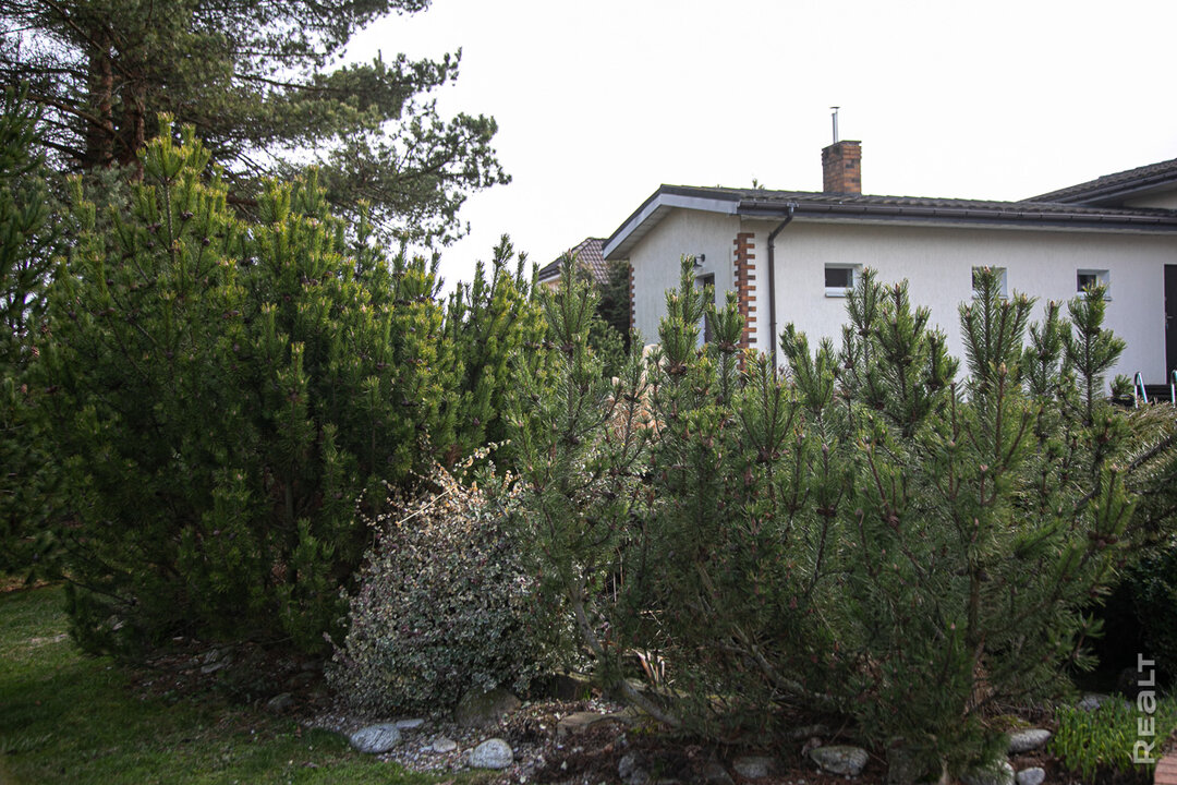 Ландшафтный дизайн на 30 сотках владельцы создали природный: взрослые сосны, ели, можжевельники, тисы. Но это и не лес — за всем явно ухаживают, поддерживая необходимый уровень декоративности. Любоваться садом можно и в ночное время — на участке сделано освещение, в том числе и акцентное.