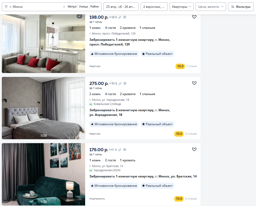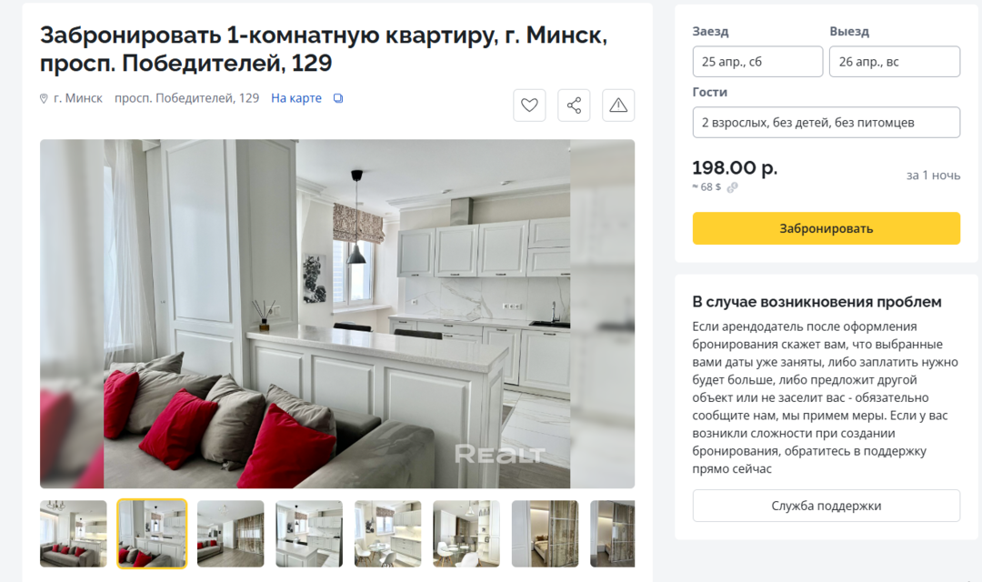 Мы просто вписали в сервисе Realt.Бронь желаемые даты (25−26 апреля) для заселения в Минске — и получили множество вариантов квартир на выбор. Конкретно эта квартира привлекла нас уютной атмосферой и близостью к СПА-центру, аквапарку и водохранилищу Дрозды. Сутки в такой квартире на выбранную нами дату стоят 198 рублей (около 68 долларов).