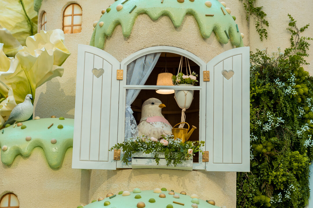 В окнах домиков оживают сказочные сюжеты: пушистые желтые цыплята-музыканты играют на крошечных инструментах, шьют, пекут куличи, строят, а в уютных гнездах замерли белоснежные голуби. Огромные распускающиеся бутоны цветов дополняют атмосферу весеннего чуда.