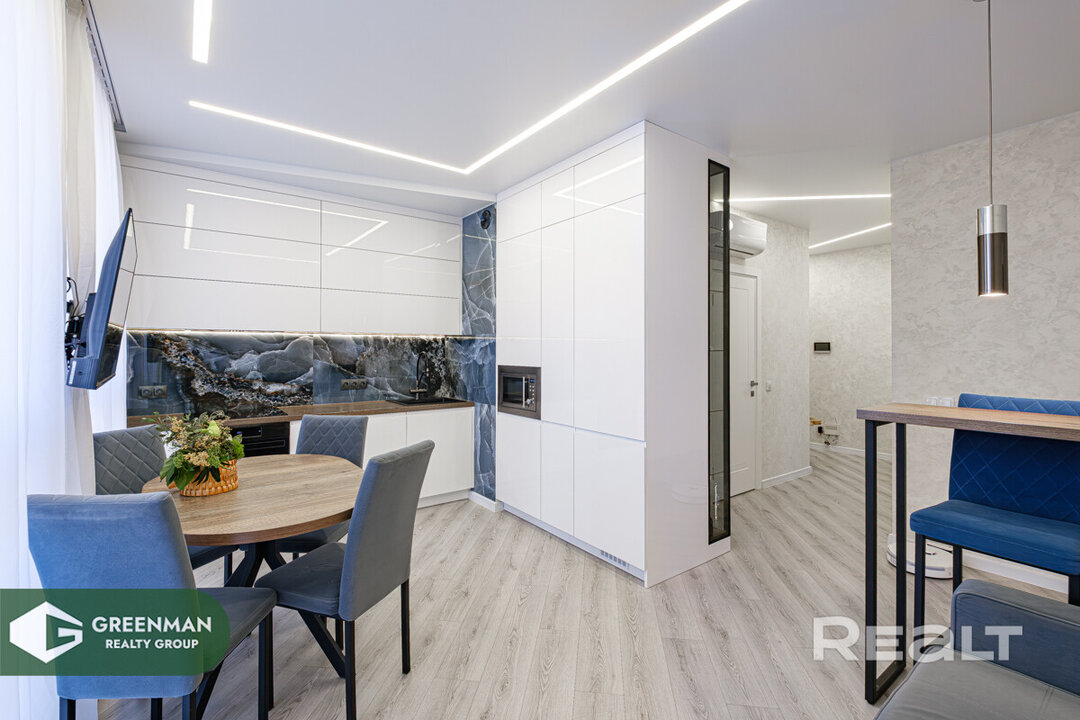 Также на продажу выставлена евротрешка с дизайнерским ремонтом и мебелью. Ее общая площадь — 56,3 квадрата. Находится она на втором этаже (фактически — третьем, так как нулевой отдан под коммерцию). Для ремонта в квартире привлекались профессиональные строители и были использованы качественные материалы. На лоджии стеклопакеты обклеены тонировочной пленкой. Квартира оценивается в 165 тысяч долларов (метр квадратный — 2 931 доллар).