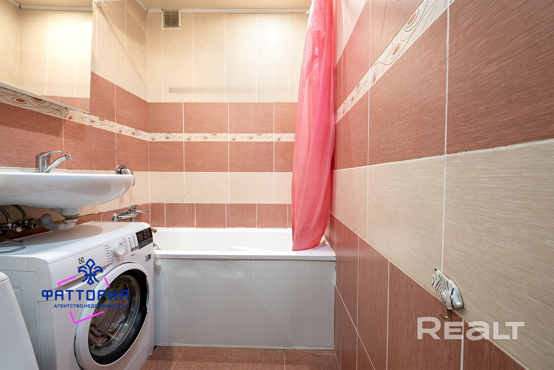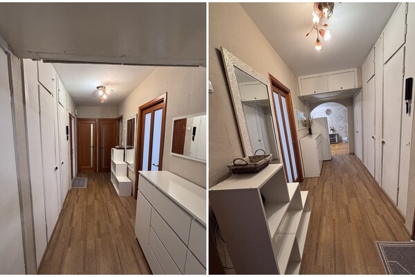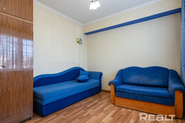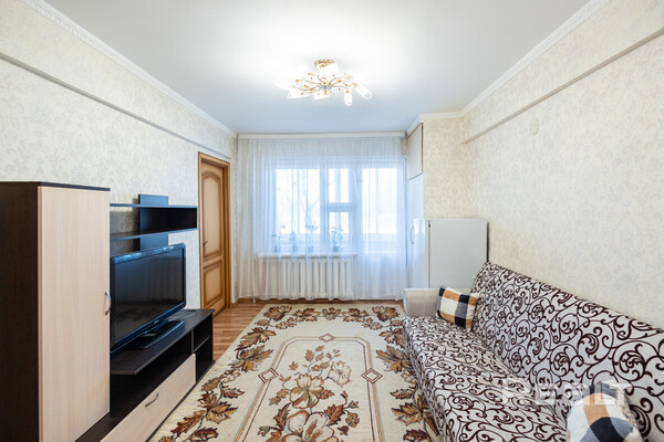 Квартира местами нуждается в обновлении, но в целом выглядит жилой. Тут заменена проводка, сантехника, стены оклеены обоями, на полу лежит ламинат, а в санузлах — плитка, сделаны натяжные потолки. В кухне для полного комплекта техники не хватает лишь холодильника. В проходной комнате есть выход на застекленный балкон.