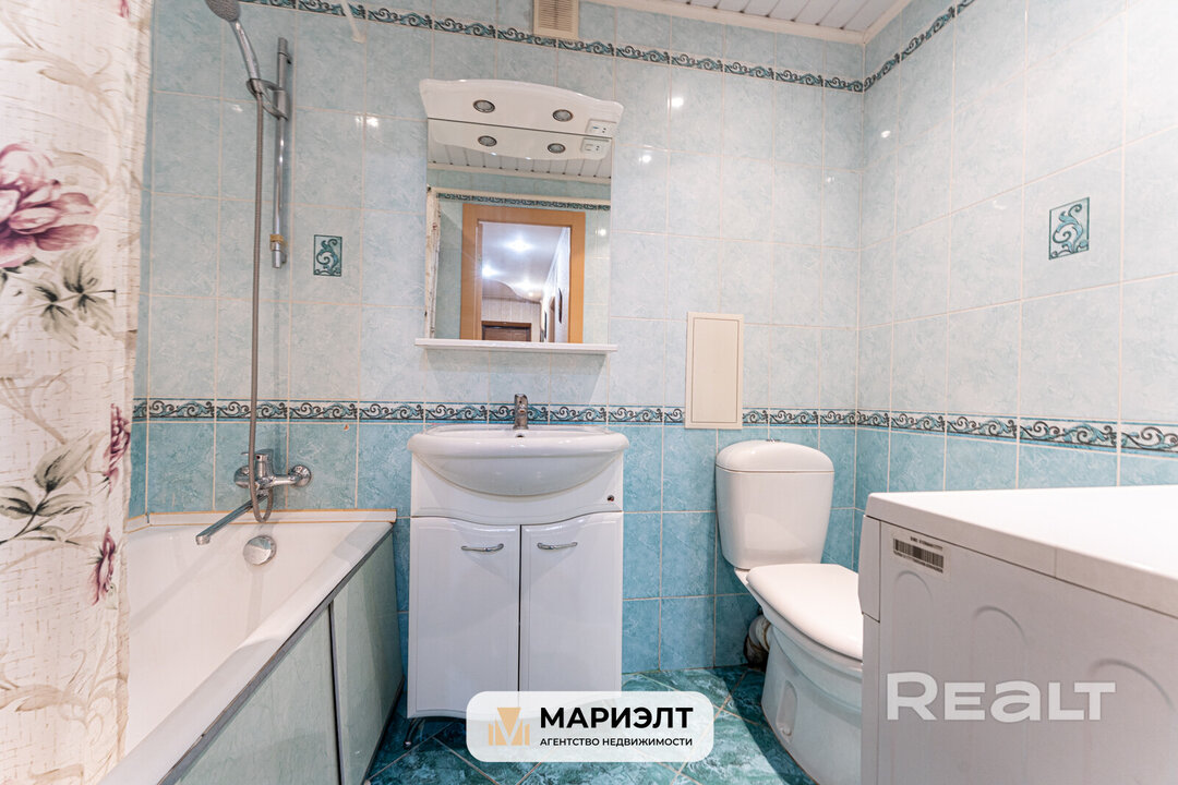 Квартира местами нуждается в обновлении, но в целом выглядит жилой. Тут заменена проводка, сантехника, стены оклеены обоями, на полу лежит ламинат, а в санузлах — плитка, сделаны натяжные потолки. В кухне для полного комплекта техники не хватает лишь холодильника. В проходной комнате есть выход на застекленный балкон.