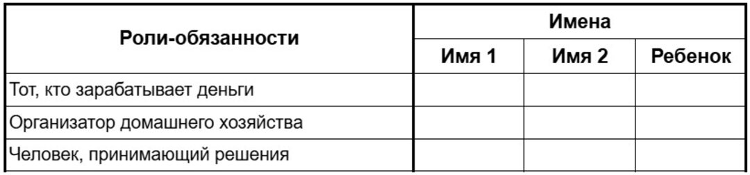 Психолог Ольга Шнаревич поделилась с нами небольшим упражнением «Семейные роли», которое поможет вам понять, как распределяется ответственность в вашей семье. Для его выполнения понадобится лист бумаги или табличка в компьютере.