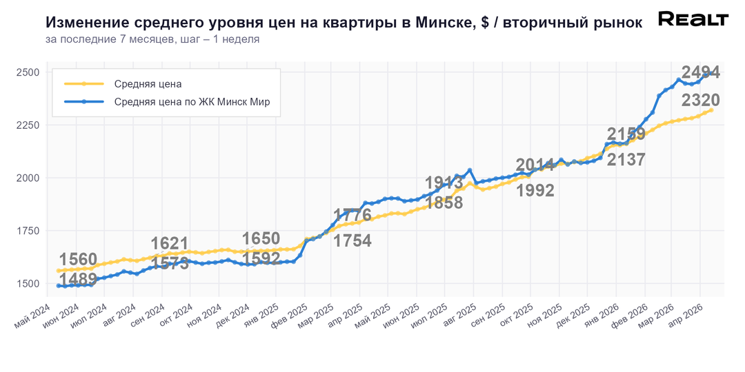 Брест — 1251 $/м2 (+0.4%), Витебск — 983 $/м2 (+0.3%), Гомель — 1071 $/м2 (+0.5%), Гродно — 1164 $/м2 (без изменений), Могилев — 1116 $/м2 (+0.8%).