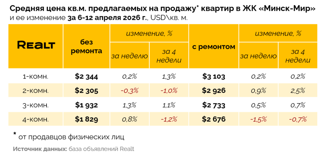 Как видно из таблиц ниже, просадка цен в горизонте последних 4 недель по Минску сошла на нет. А в Минск-Мире даже квартиры без ремонта, которые еще недавно снижались в цене и показывали красные значения с минусом, за прошлую неделю серьезно компенсировали месячную просадку.