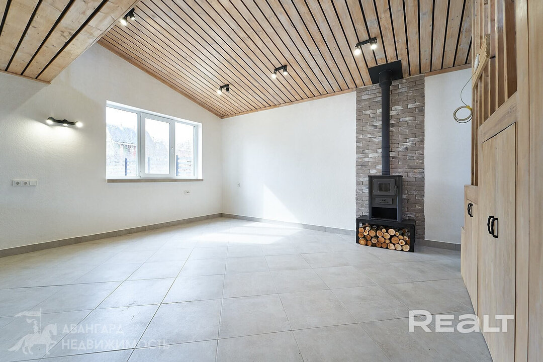 Остальные метры покупателю нужно будет обставить самостоятельно. Но здесь легко поместятся диван, кресла напротив печки-камина и обеденный стол.