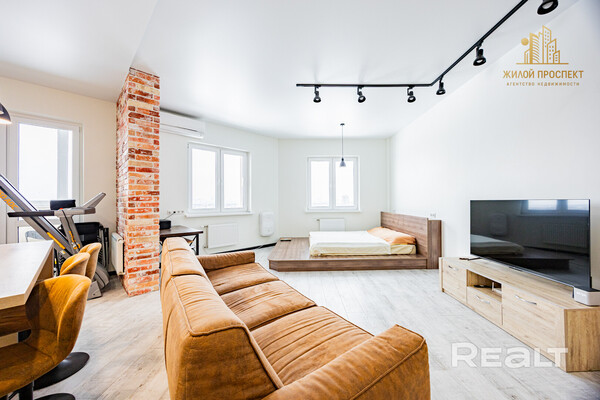 Общая площадь квартиры с трехметровыми потолками насчитывает 50 квадратных метров. Внутри сделан современный ремонт. Планировка — открытое пространство, поделенное на функциональные зоны кухни, гостиной и спальни. Кухня уже оснащена всей необходимой техникой, а освещение подключено к системе автономного умного дома. Есть в однушке кондиционер и система вентиляции (свежий воздух без шума и пыли).