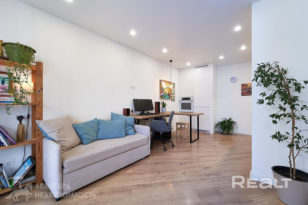 Однушка полностью готова для проживания. В объявлении отмечается: «все, что представлено на фотографиях, останется новому владельцу». Так, на кухне уже есть вся необходимая встроенная техника: духовой шкаф с функцией СВЧ, индукционная варочная панель, посудомоечная машина, холодильник и система очистки воды для комфорта и здоровья. Жилая комната в квартире совмещает в себе сразу два пространства — гостиную и спальную зоны. Есть в квартире рабочий кабинет и место для релакса (утепленная лоджия). Продают жилье за 301 тысячу рублей или 106 тысяч долларов.