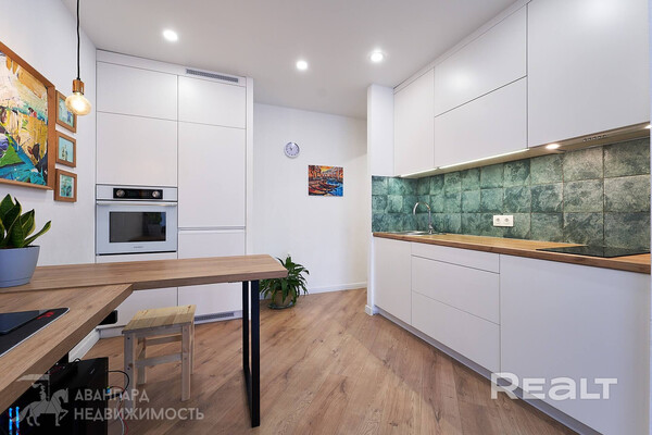 Общая площадь квартиры составляет 38 квадратных метров. Евродвушка состоит из просторной кухни-гостиной и отдельной спальни. Внутри уже сделан современный ремонт. Напольное покрытие — ламинат и плитка, стены — обои под покраску, наверху — натяжной потолок. Будущим жильцам не придется беспокоиться о покупке техники. Тут уже есть холодильник, духовой шкаф, варочная панель, вытяжка, стиральная машина.
