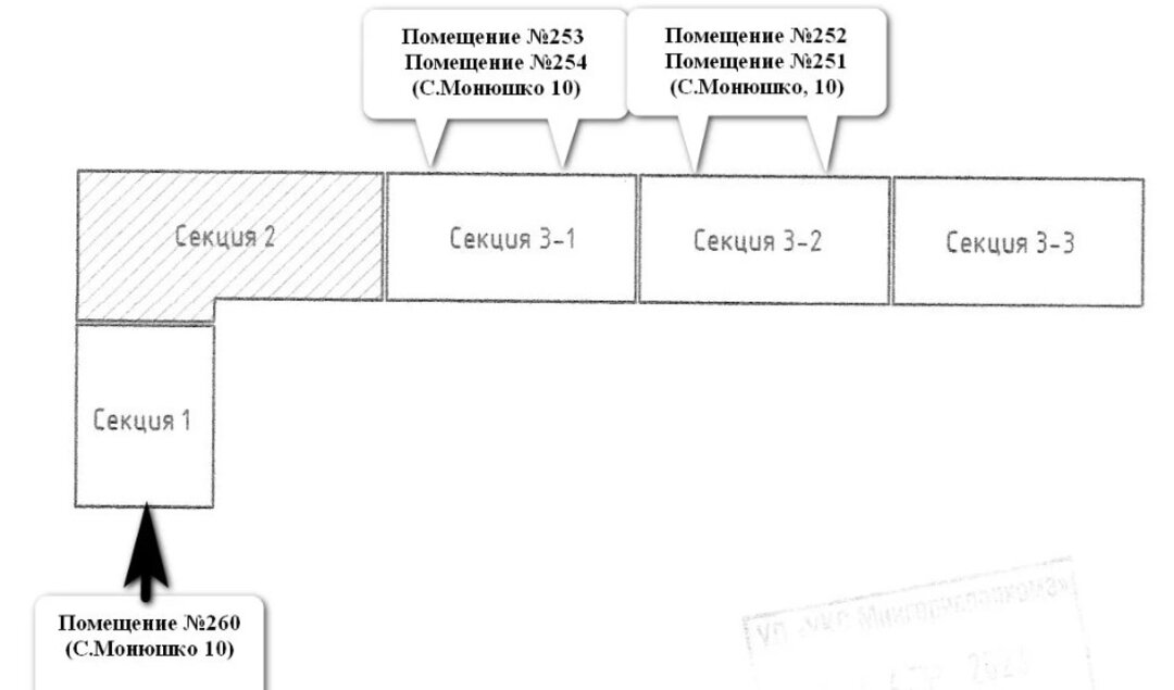 2) Помещение физкультурно-оздоровительного или спортивного назначения общей площадью 137,5 м² с машиноместом. Начальная стоимость помещения с учетом НДС — 382 442,98 BYN, размер задатка — 38 000 BYN. Чтобы ознакомиться с планировкой, нажмите сюда.