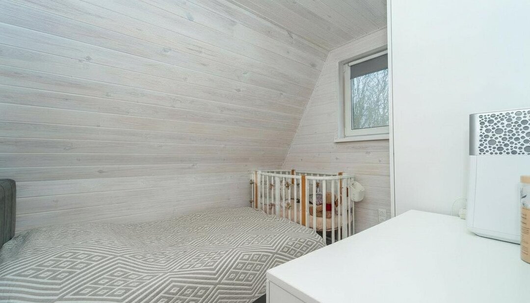 Панорамным видом и высокими потолками выделяется совмещенная кухня-гостиная. Перемещаемся в глубь. В отдельном помещении размещены санузел с душем и стиральной машиной. Рядом находится котельная, а напротив — жилая комната. Сейчас пара с ребенком обосновались там. Спальня хоть и небольшая, но вмещает полноценную кровать, шкаф, комод и кроватку для малыша.