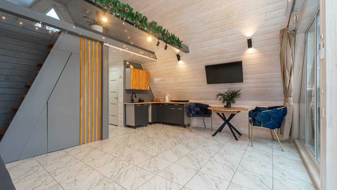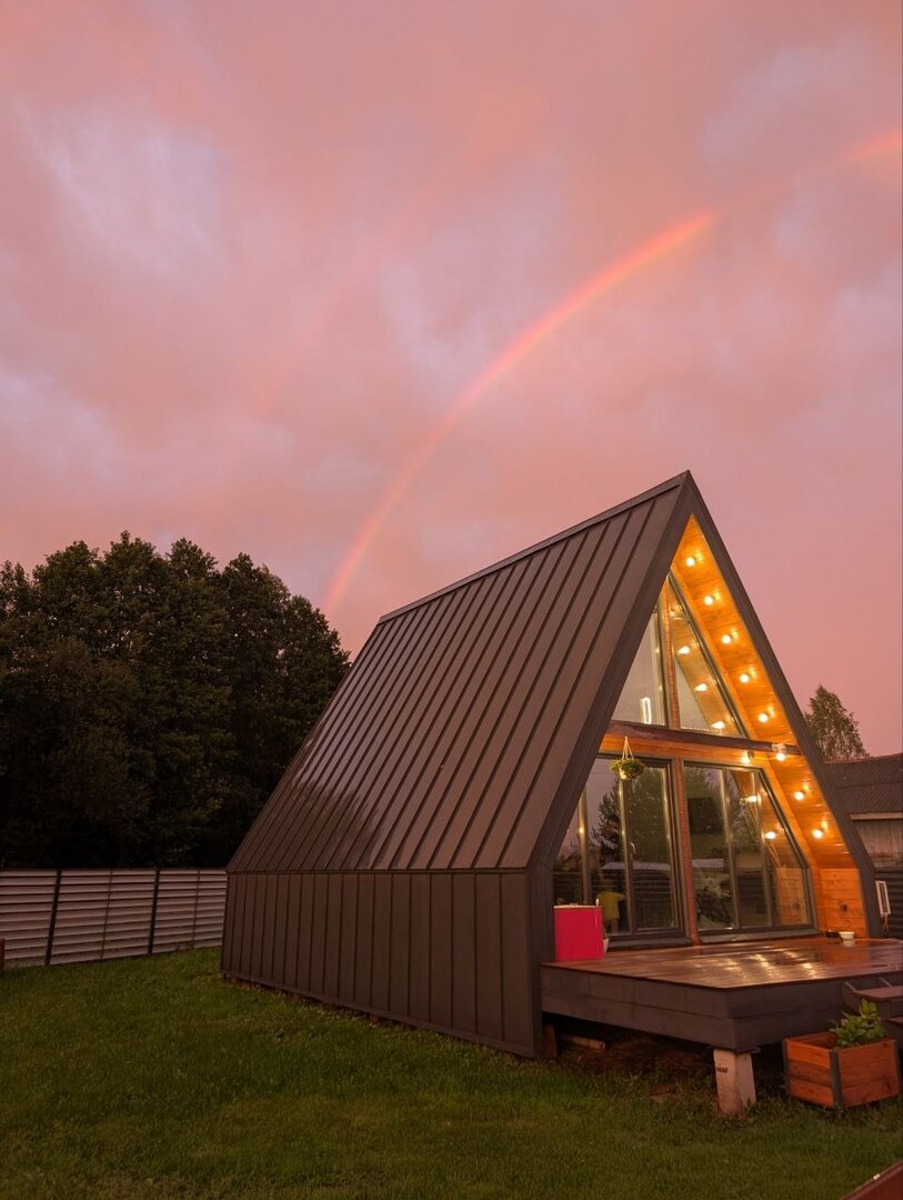 С проектом первого дома супруги определились быстро. Вариант треугольника — A-frame — достаточно популярный в сфере туризма и не требует больших вложений. Единственное, им хотелось сделать его не стандартного размера, а чуть больше. Поэтому в этом доме есть аттиковая стена, которая делает его приподнятым. Получилось 54,5 м².