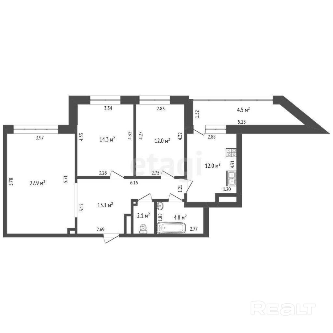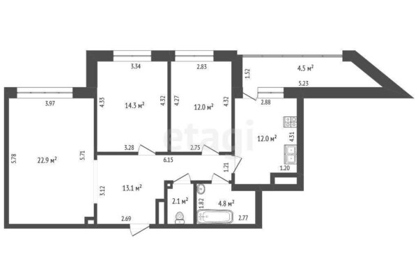 Следующее предложение — трехкомнатная квартира общей площадью 81 квадратный метр. Жилье находится на 11-м этаже. Трешка состоит из трех комнат и отдельной кухни. Новые хозяева смогут переоборудовать жилье в еврочетырешку, где будет просторная кухня-гостиная на 23 квадрата и 3 изолированные спальни. Окна в квартире смотрят на юго-запад, на застекленной лоджии можно обустроить кабинет или оформить чилаут-зону. Судя по фото, жилье нуждается в обновлении. Стоимость — 501 тысяча рублей, или 178 тысяч долларов (5856 рублей, или 2077 долларов — за метр).