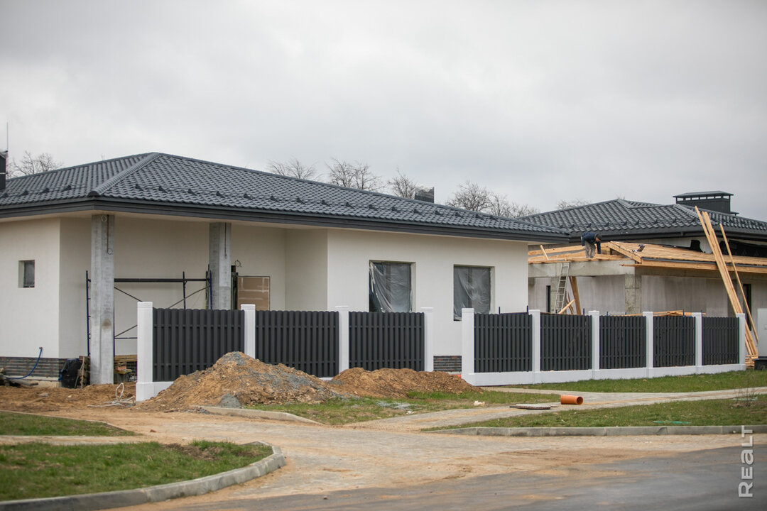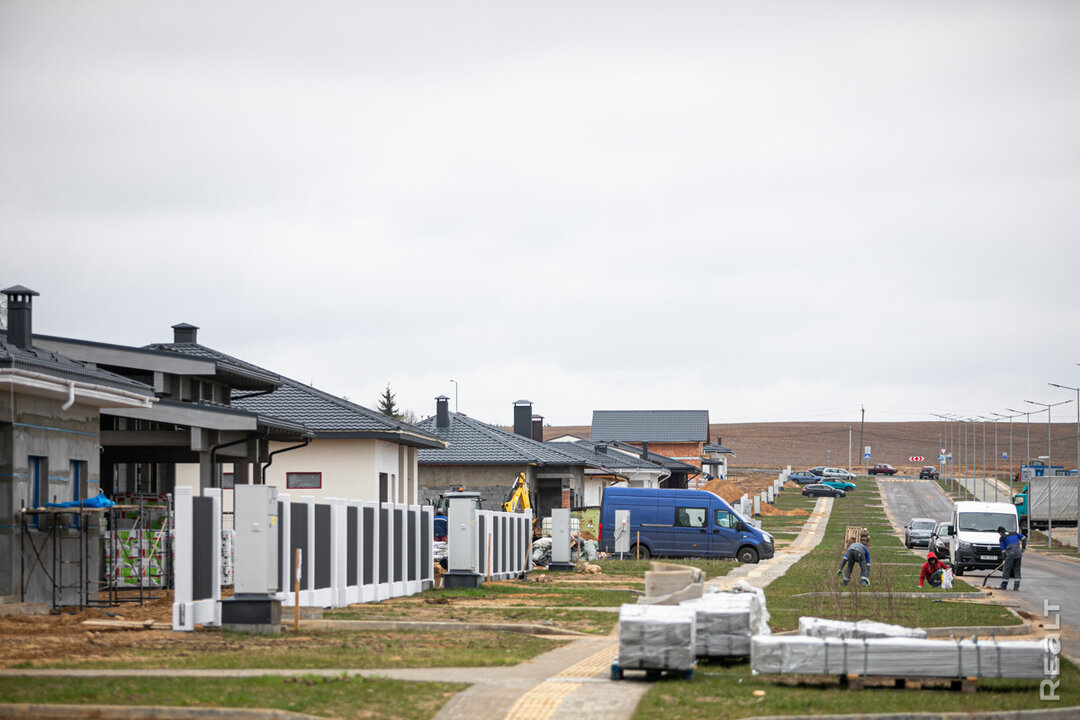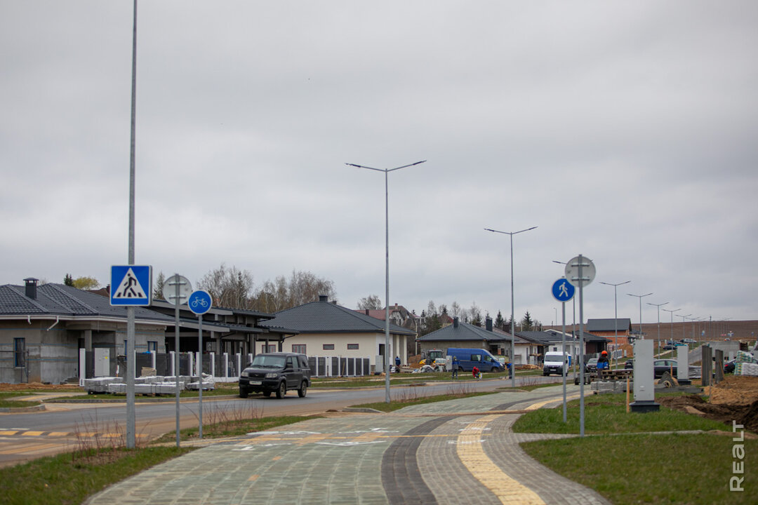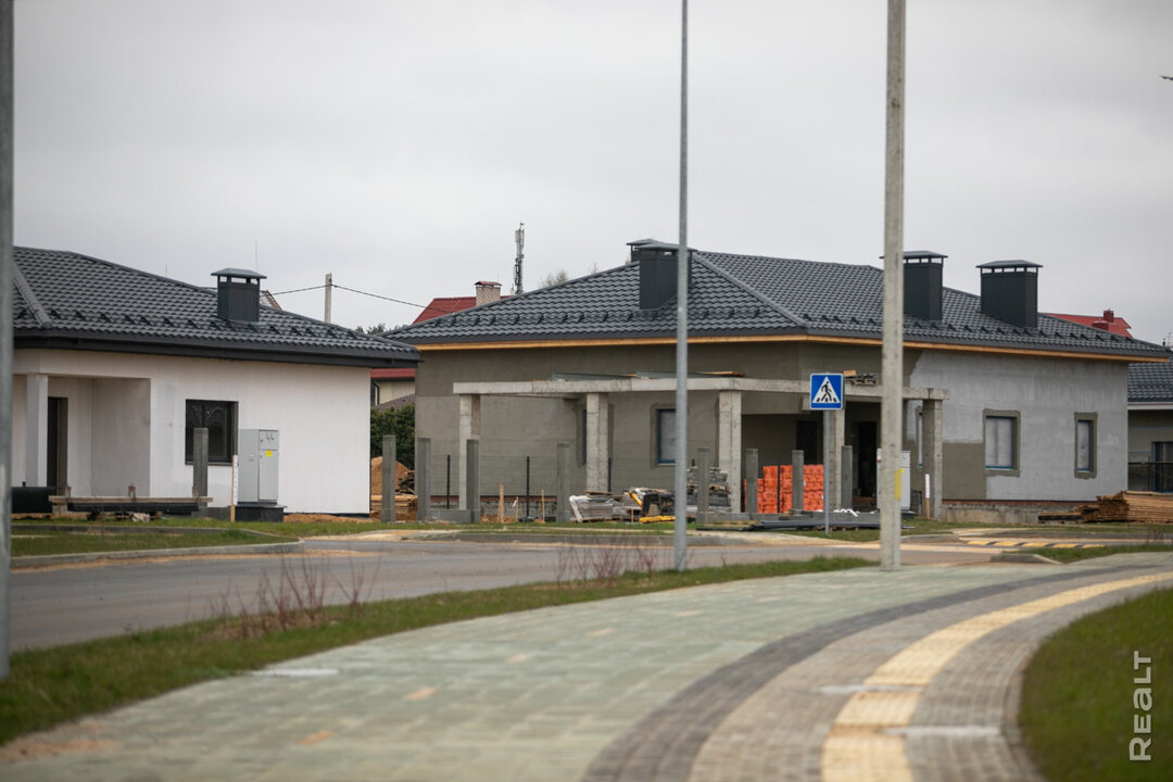 Первые дома поселка (те, которые мы увидели в прошлом году) были панельными, что натолкнуло нас на мысль о типовом квартале. Однако сейчас на новоиспеченной улице коттеджей можно рассмотреть почти все типы индивидуального домостроения, популярные в Беларуси. Тут есть и блочные, и кирпичные, и даже деревянные. Мы не встретили разве что каркасники.