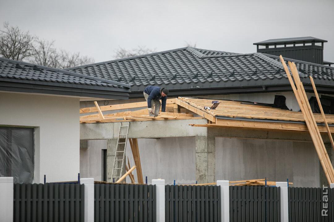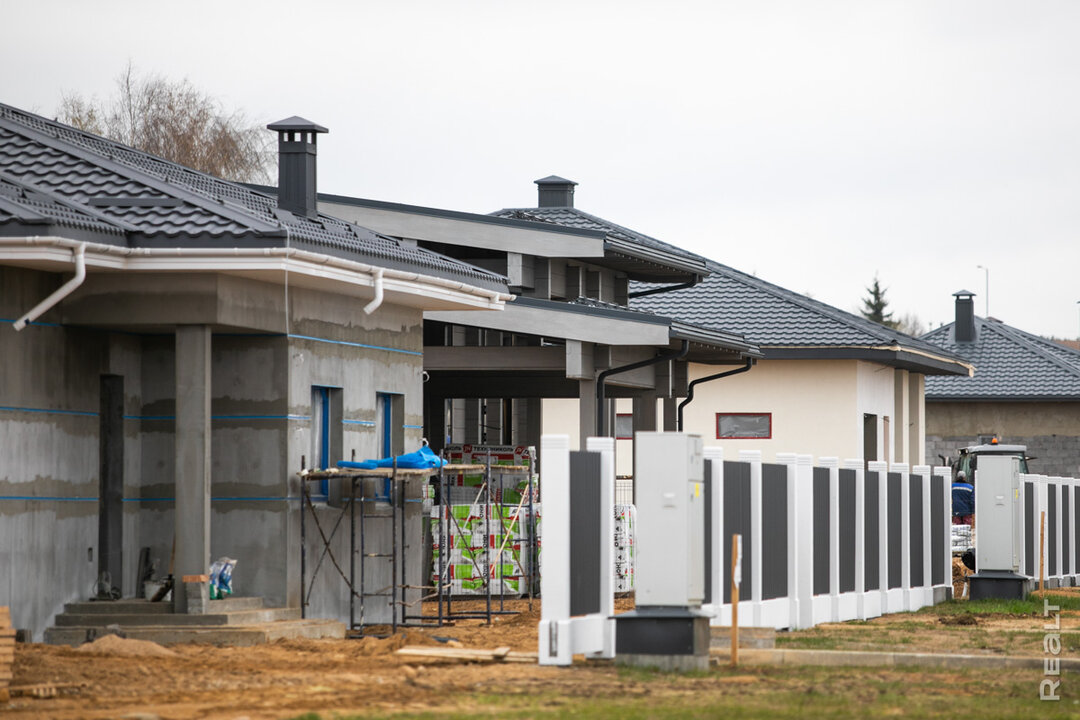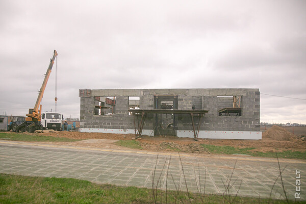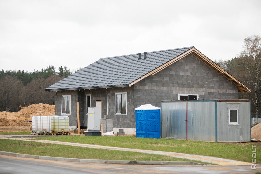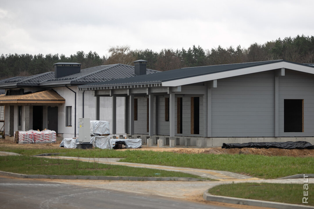 Первые дома поселка (те, которые мы увидели в прошлом году) были панельными, что натолкнуло нас на мысль о типовом квартале. Однако сейчас на новоиспеченной улице коттеджей можно рассмотреть почти все типы индивидуального домостроения, популярные в Беларуси. Тут есть и блочные, и кирпичные, и даже деревянные. Мы не встретили разве что каркасники.