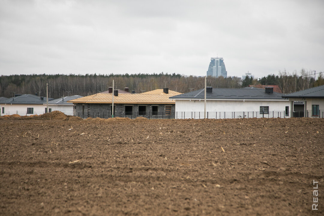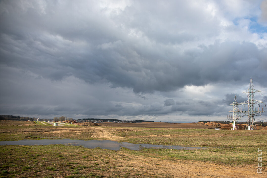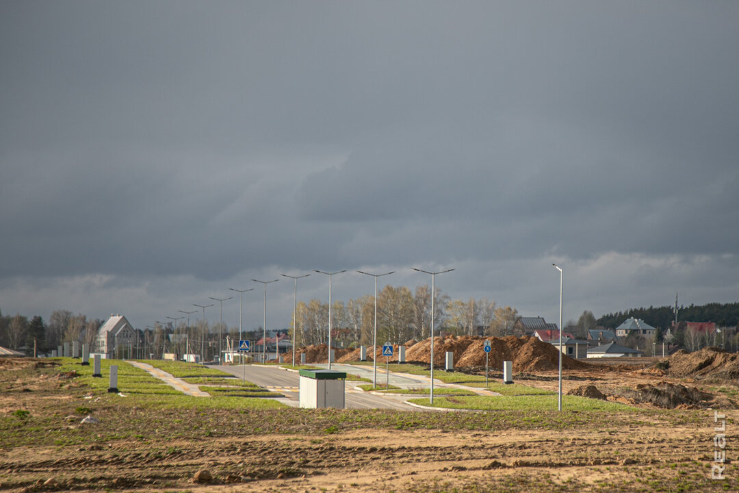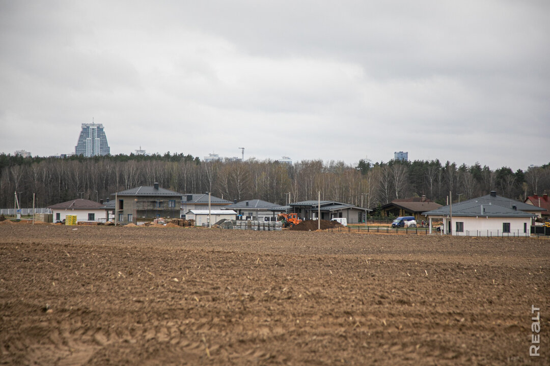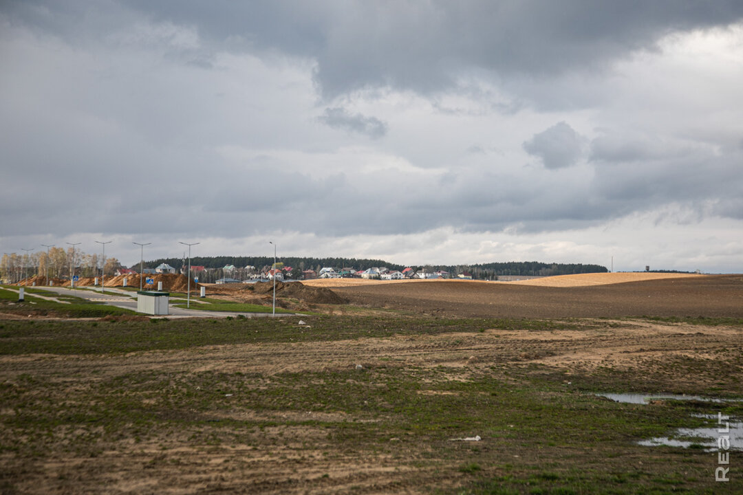 Сейчас новый коттеджный микрорайон расположен буквально в чистом поле. Однако присмотритесь к строительным кранам на фото — это совсем рядом тянутся вверх дома жилого комплекса «Левада». Отсюда можно будет пешком дойти до набережной Свислочи, а также быстро доехать до улиц Орловской и проспекта Победителей.