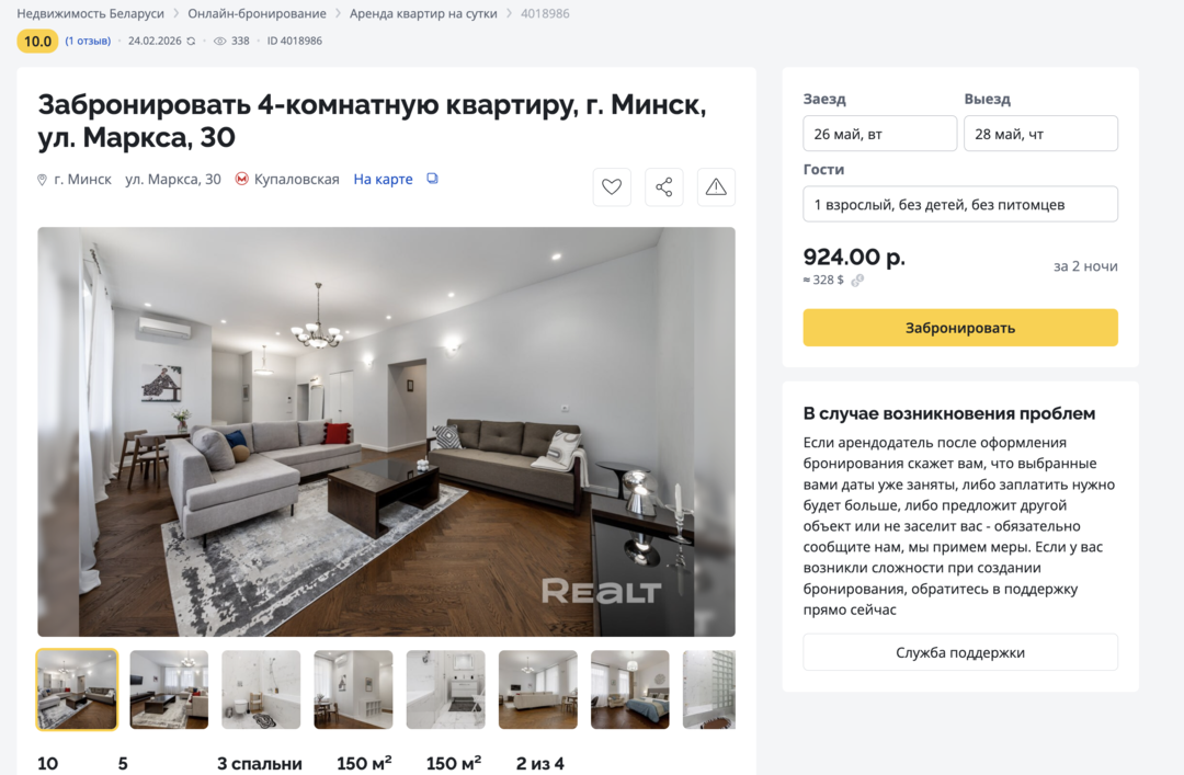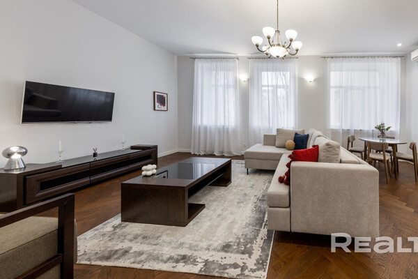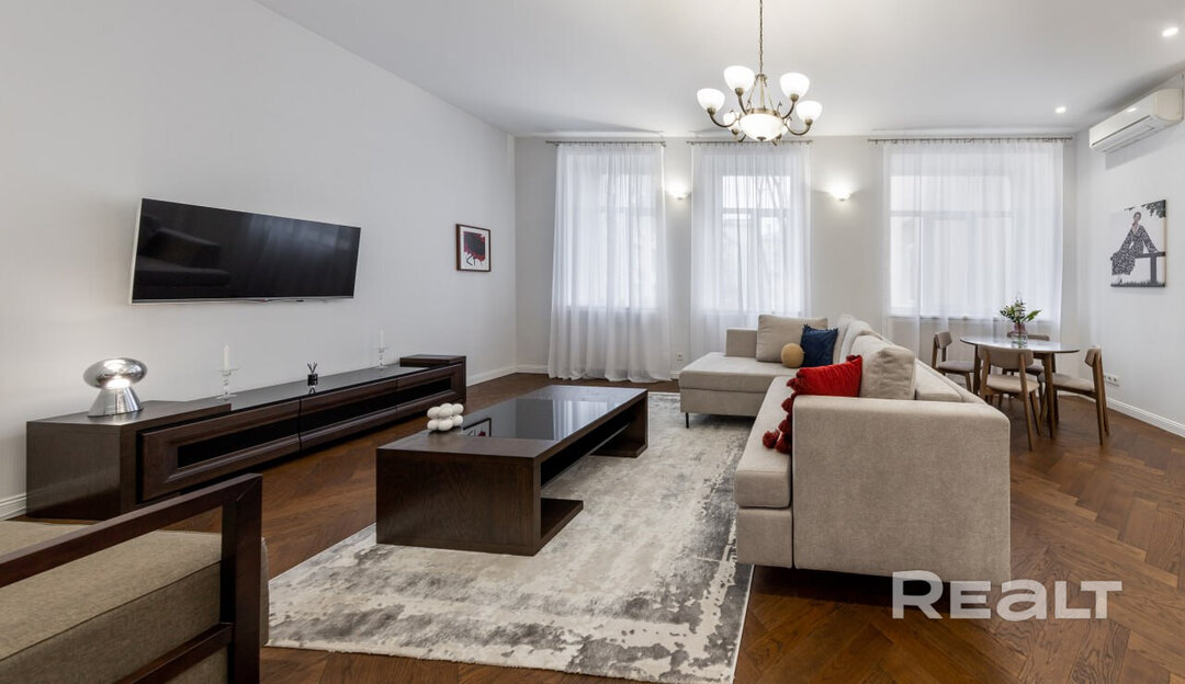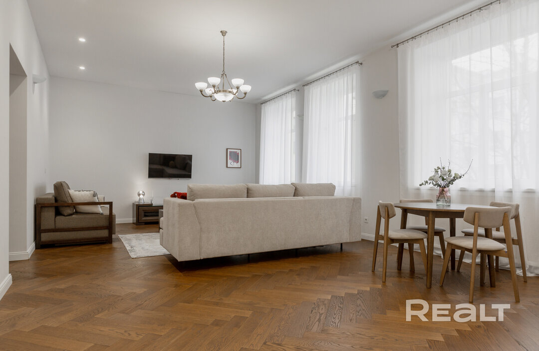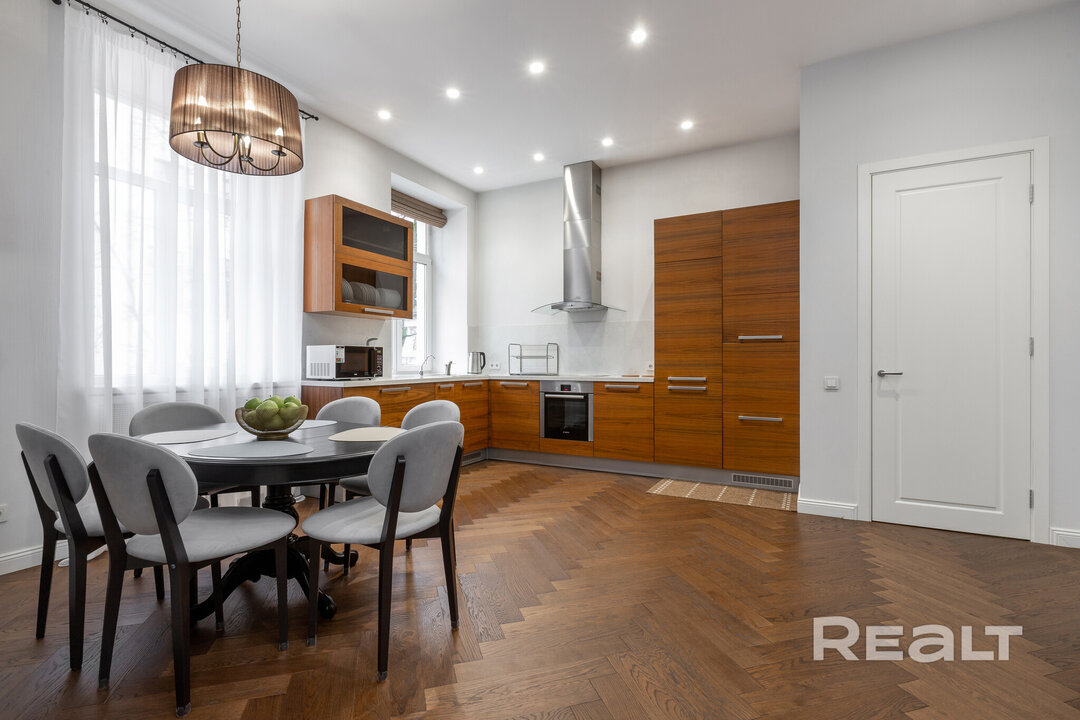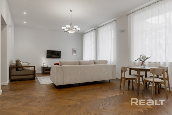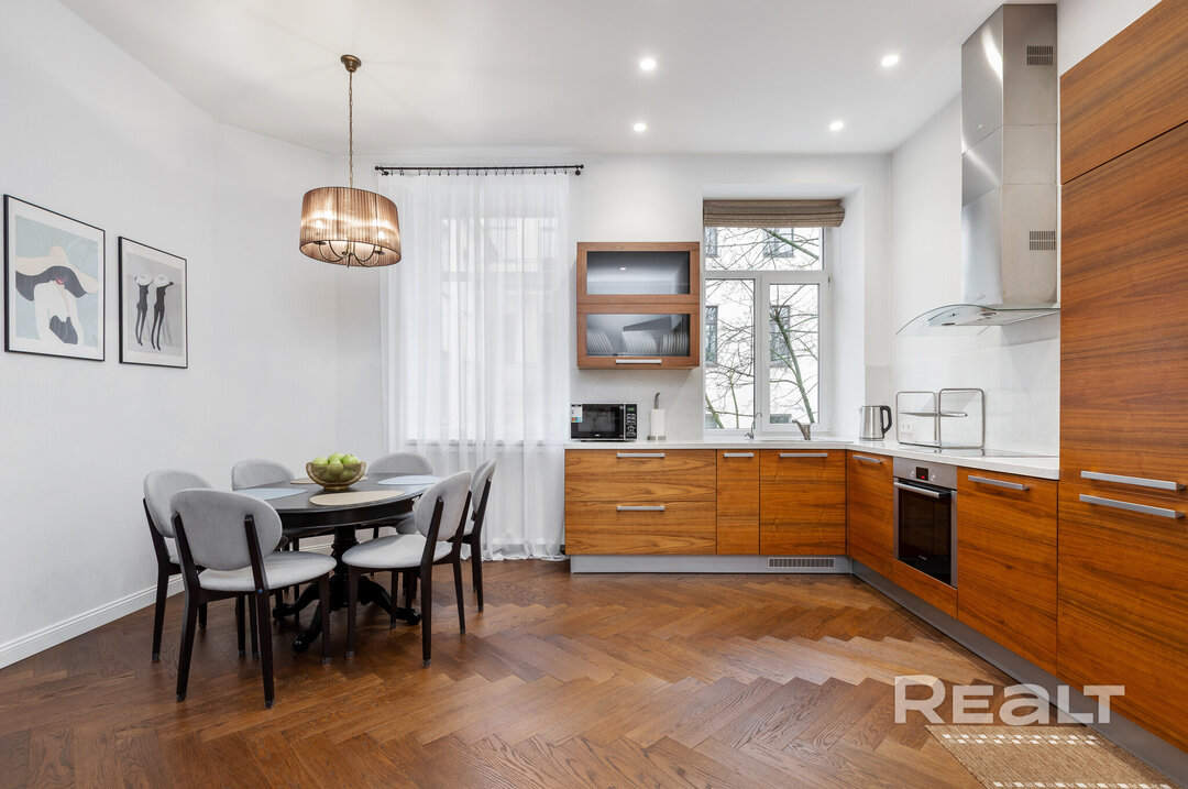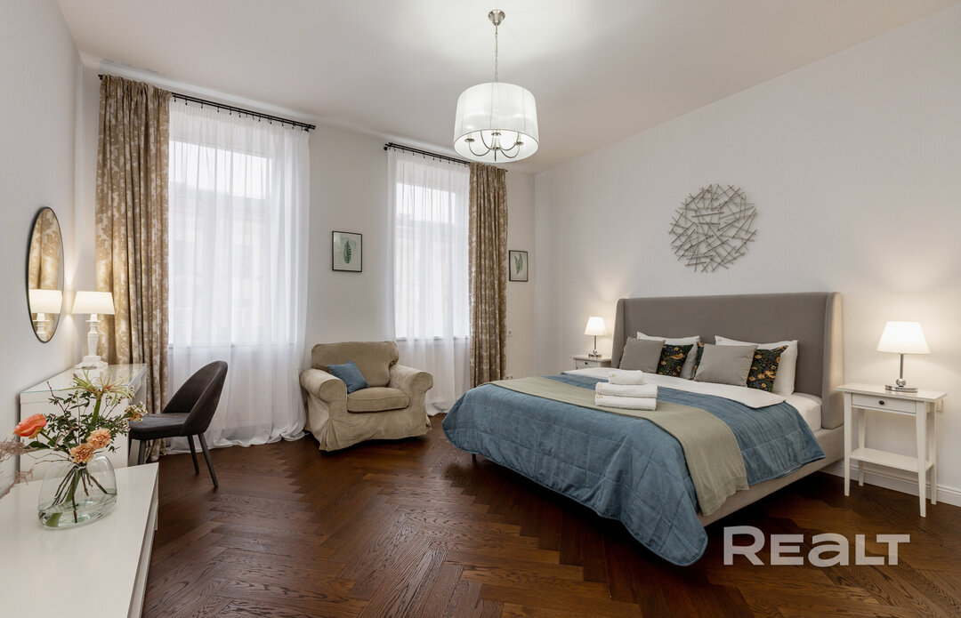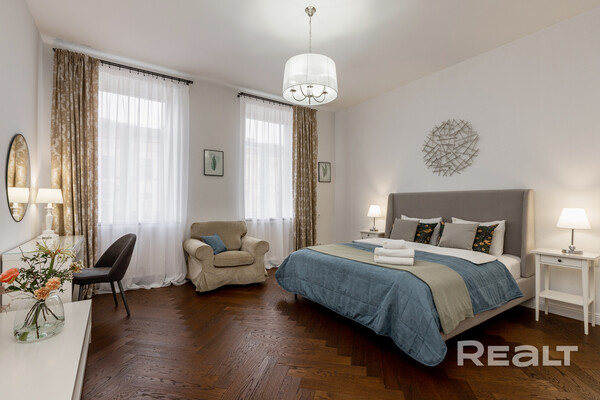374Этот дом в самом центре Минска построен больше ста лет назад. Его возводили как доходный — квартиры там сдавали в аренду, а владельцем был врач. Здание пережило две войны и в прошлом веке здесь селилась партийная элита, писатели и поэты. Интересно, что и сейчас, в 2026 году, здесь можно снять квартиру в аренду. Симпатичный вариант на сутки — светлую четырехкомнатную квартиру с приятным ремонтом — мы нашли в сервисе Realt.Бронь.