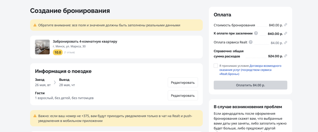 Дальше нажимаем кнопку «забронировать» и оплачиваем услуги сервиса — 10% от стоимости аренды. После оплаты сервиса свяжется хозяин, с которым можно будет обсудить детали заселения. Никаких подводных камней и изменений условий.