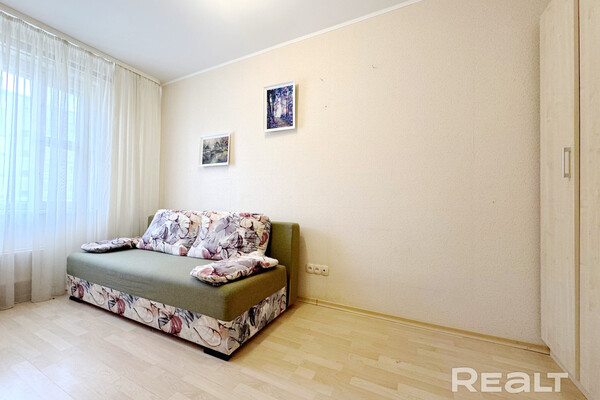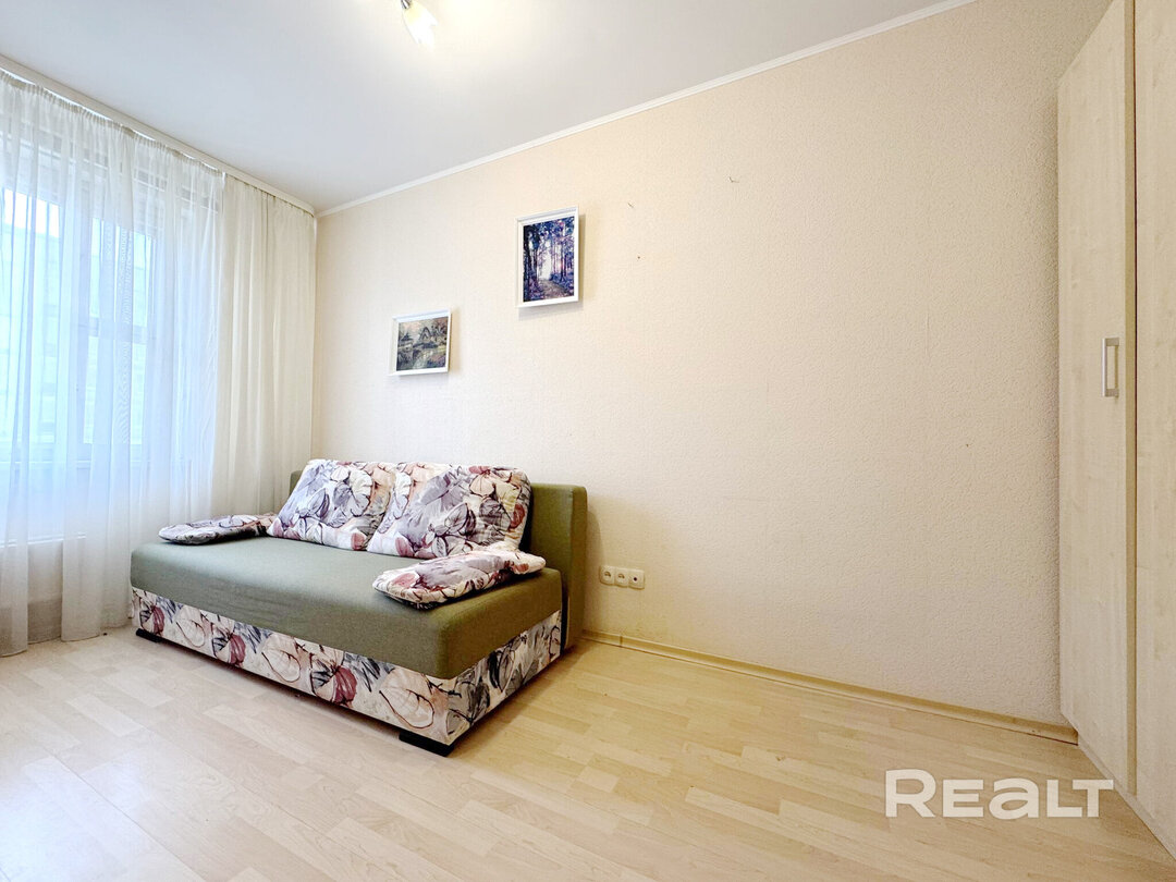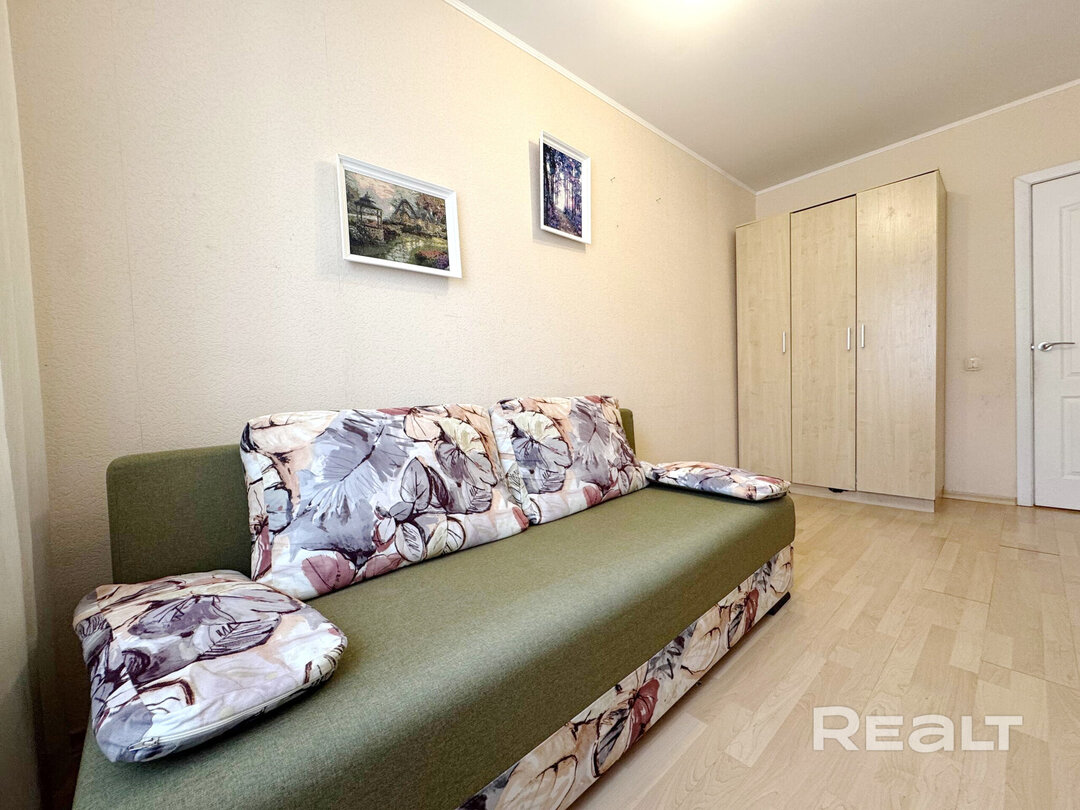 Квартира готова к проживанию, выставляется с хорошим ремонтом: стены оклеены обоями, на полу лежит ламинат. В окнах установлены стеклопакеты. Обе комнаты здесь изолированные. В одной обустроена спальня. В гостиной есть выход на застекленный балкон. Также в нише установлен шкафа-купе. Встроенная кухня идет с варочной панелью, духовым шкафом и вытяжкой.
