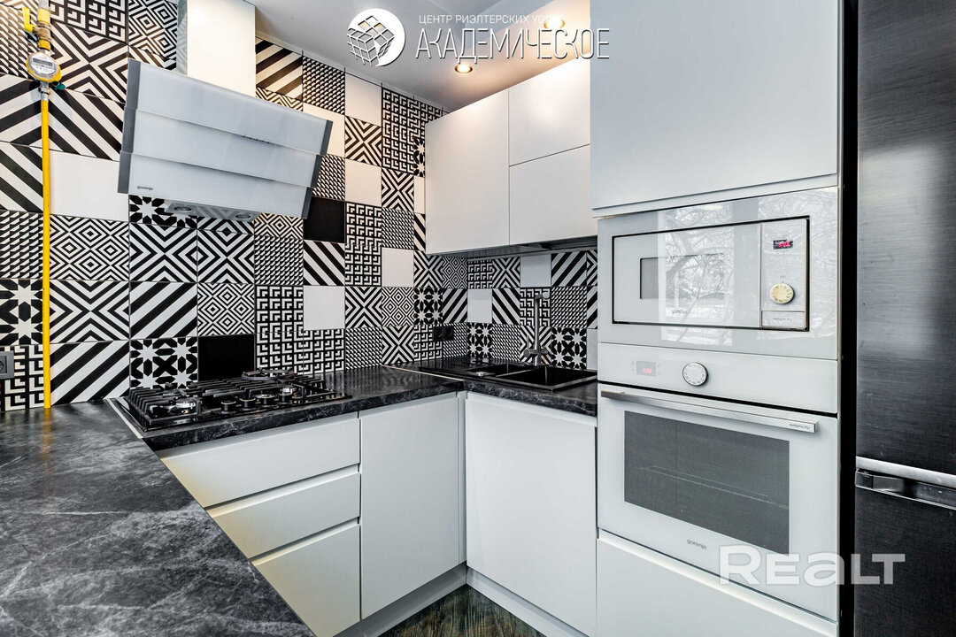 Кухня оборудована варочной панелью, духовым шкафом и микроволновкой бренда Gorenje, посудомоечной машиной Bosch и холодильником Samsung. Установлены система очистки воды с обратным осмосом и измельчитель пищевых отходов.