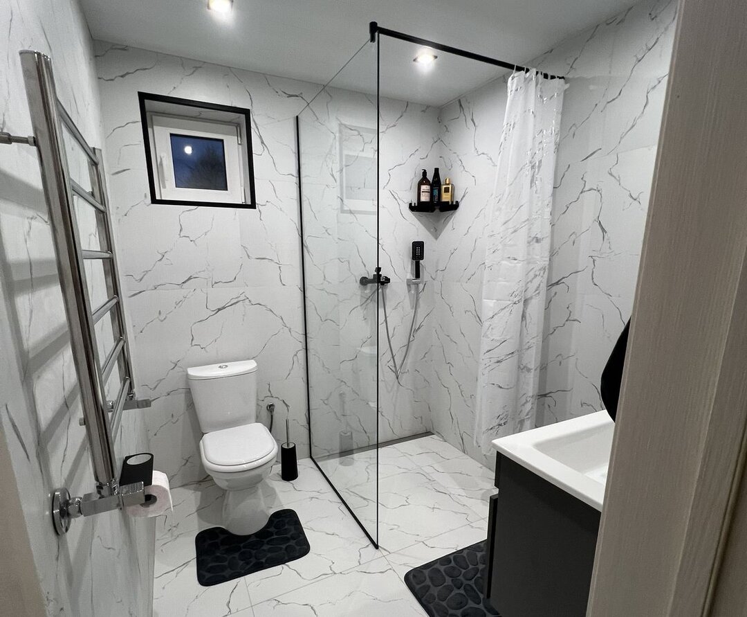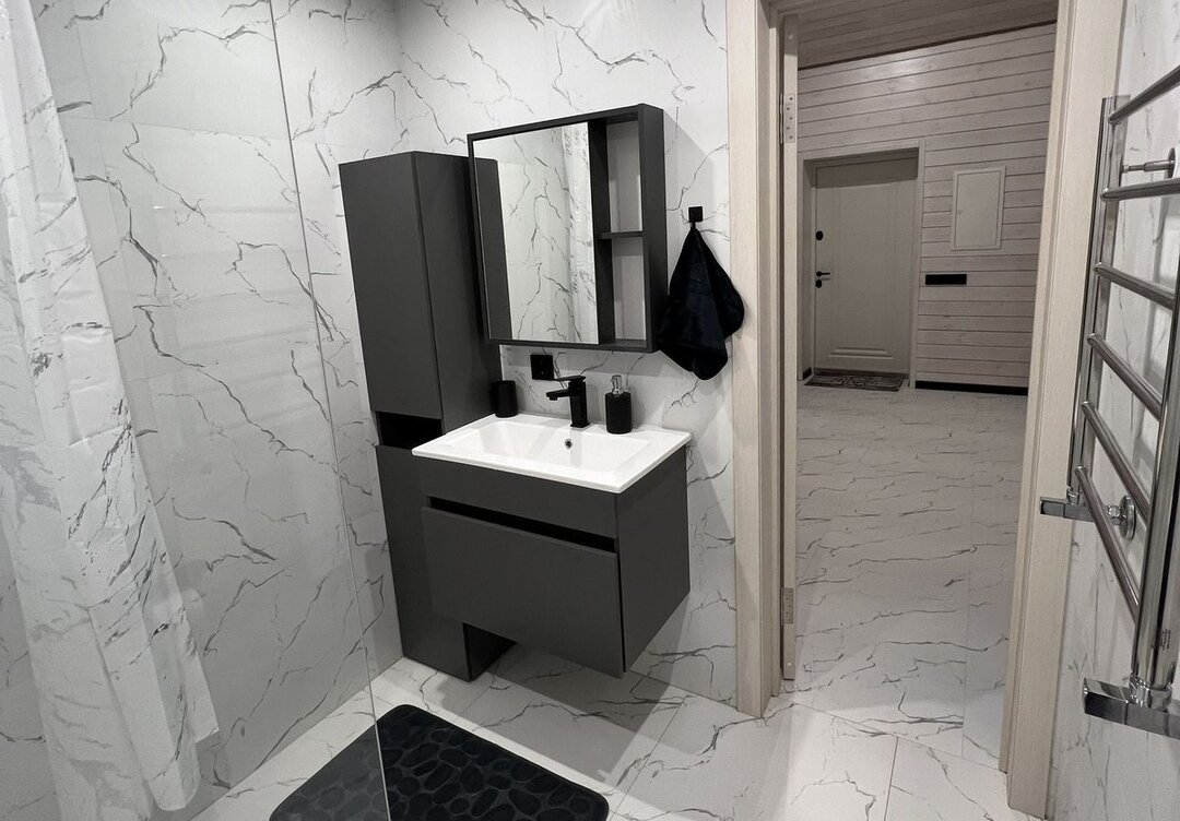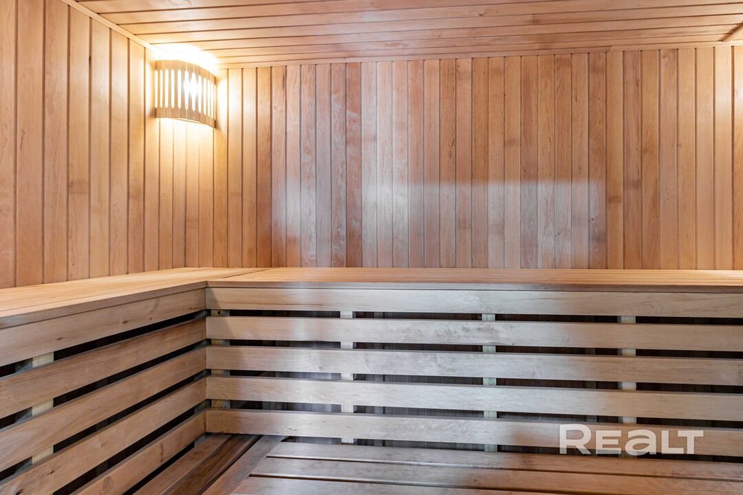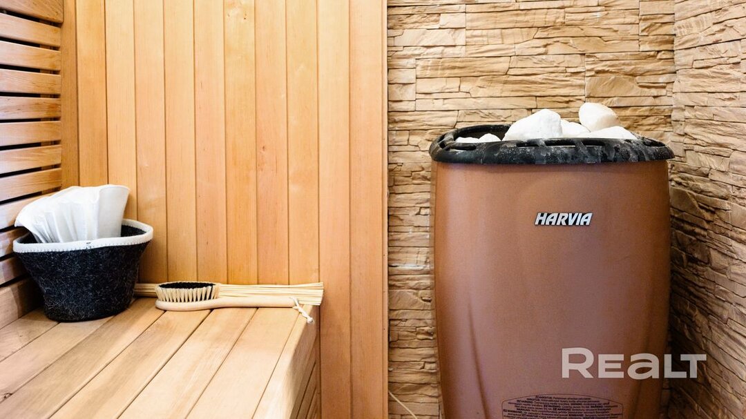 В сауне стоит финская печь-каменка Harvia, с выносным пультом управления и возможностью лить воду на камни. В прачечной — стирально-сушильная машина Viomi Master 2 на 10 кг.