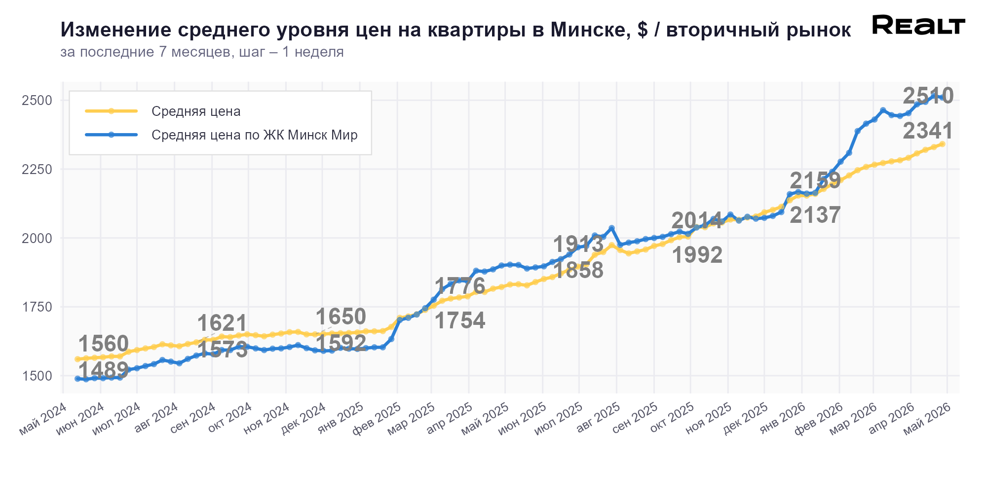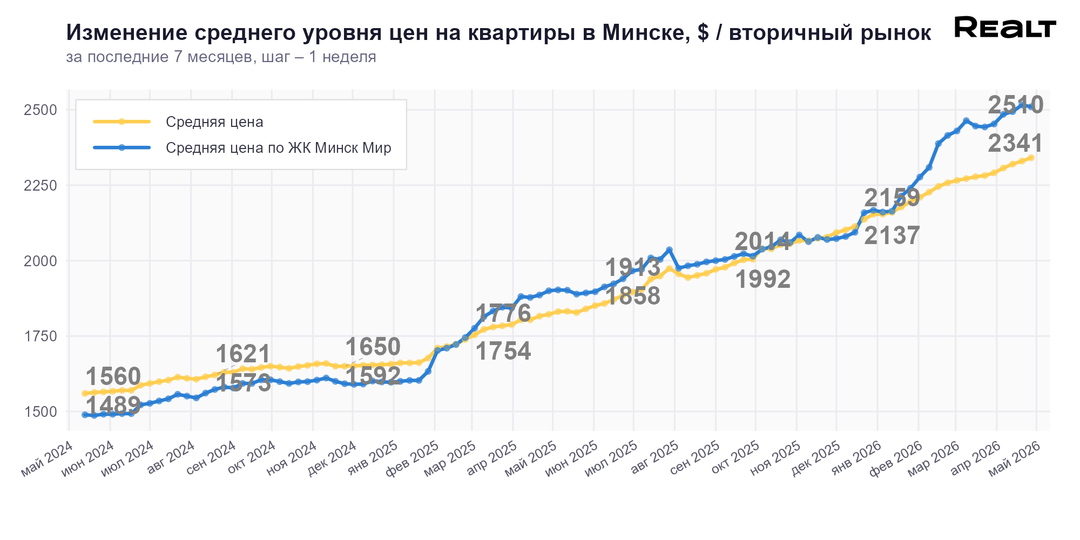 В результате средняя цена квадрата в объявлениях по всему Минску, за прошедшую неделю изменилась в рамках погрешности, но снова в плюс — на +0.5% до уровня 2341 $/м2.