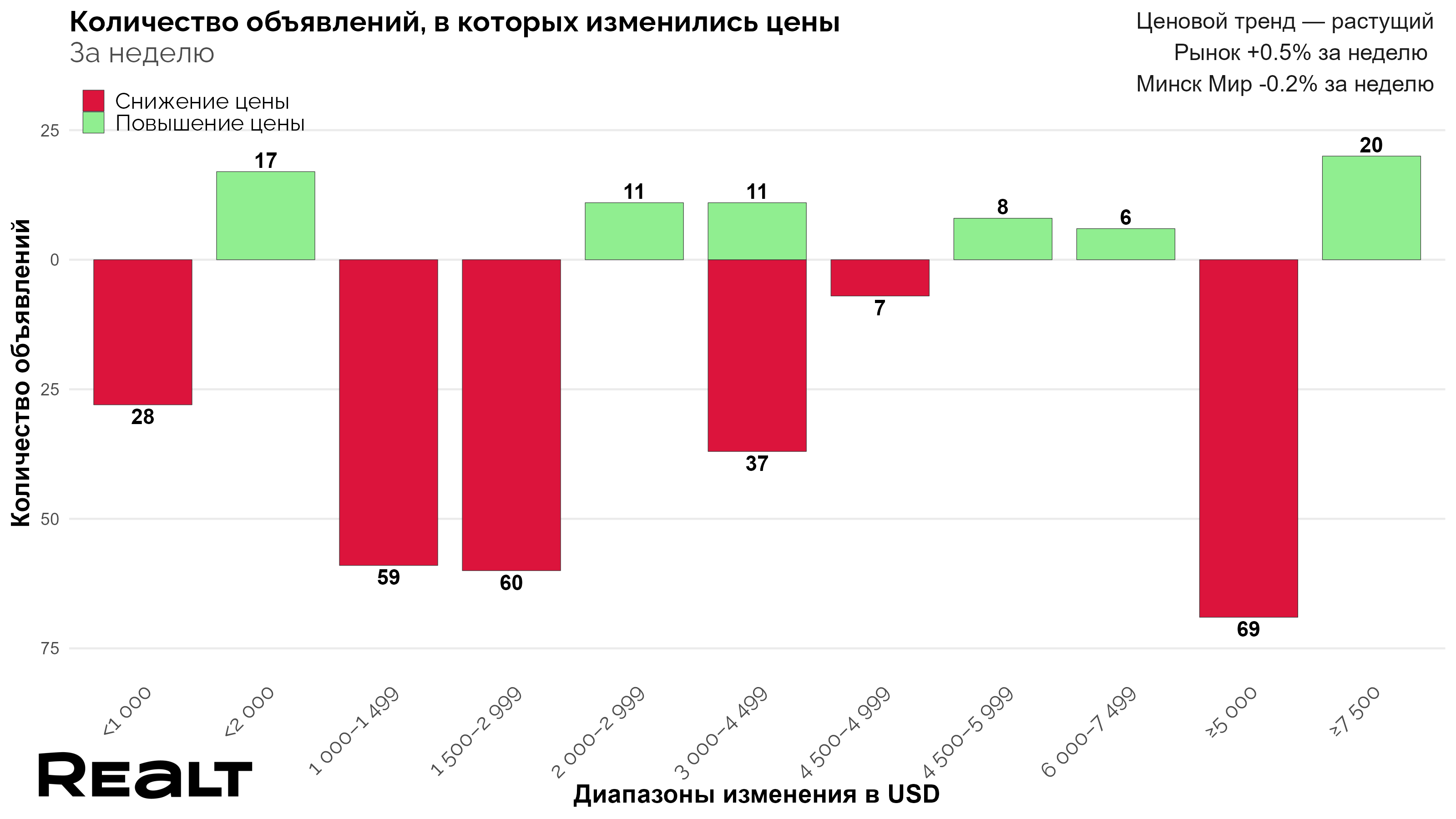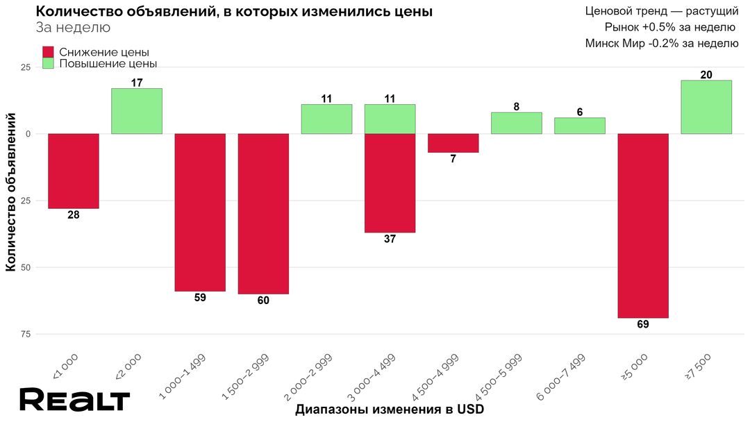 В целом по Минску за прошлую неделю подешевело 7% квартир от общего объема предложения (289 квартиры, в среднем на 1000−5000 долларов), а доля случаев увеличения цены всего 3% — стали дороже 119 квартир в среднем на 2000−7500 долларов.