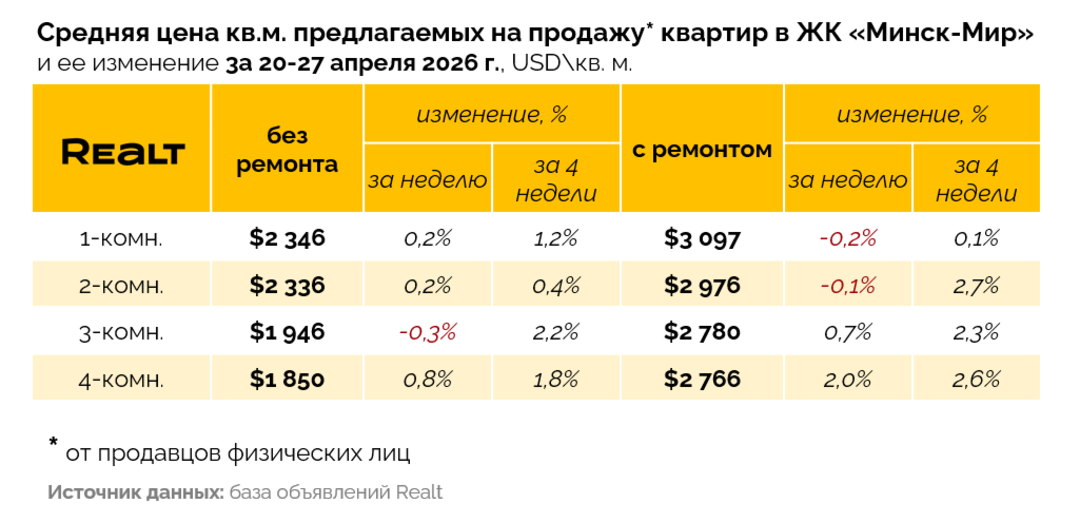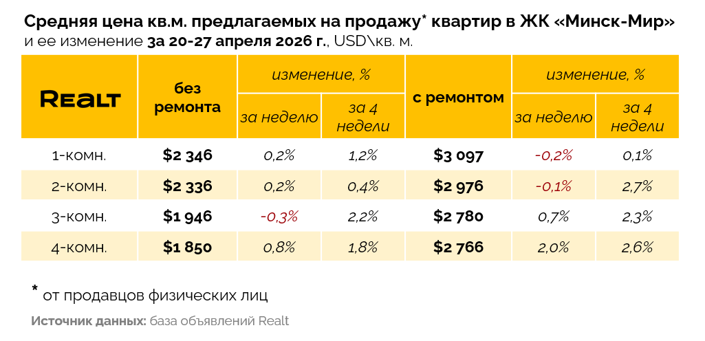299Несмотря на то, что квартир в продаже становится меньше, покупателей не прибавилось — апрель проходит слабее марта. А среди однокомнатных квартир неожиданно появился существенный минус в ценах. Второй минус с начала года показал и «Минск-Мир». Но скоро все может изменится. Подробности — в аналитике Realt.