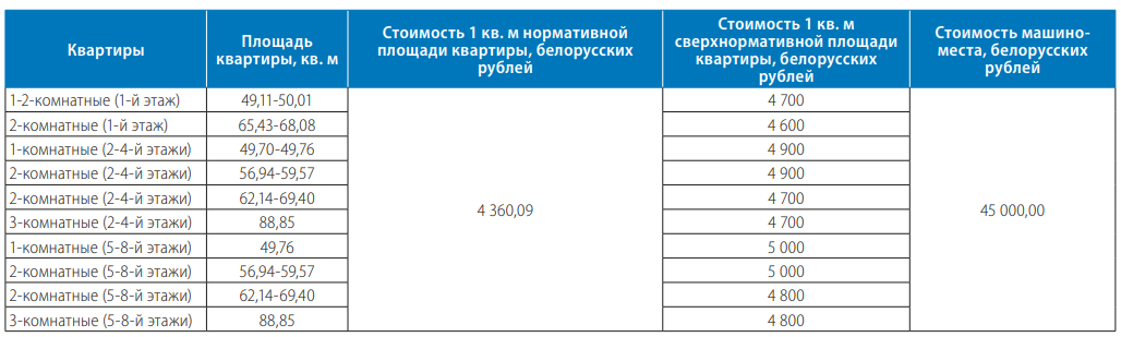 Стоимость квадрата для граждан, состоящих на учете нуждающихся в улучшении жилищных условий, составляет 4360 рублей (около 1550 долларов). Это касается нормированной площади — 15 квадратных метров на человека (при строительстве для одного человека однокомнатной квартиры — 30 квадратов). Метры сверх нормы нужно оплачивать по другим ценам — от 4600 до 5000 рублей (1635−1775 долларов), в зависимости от метража квартиры.