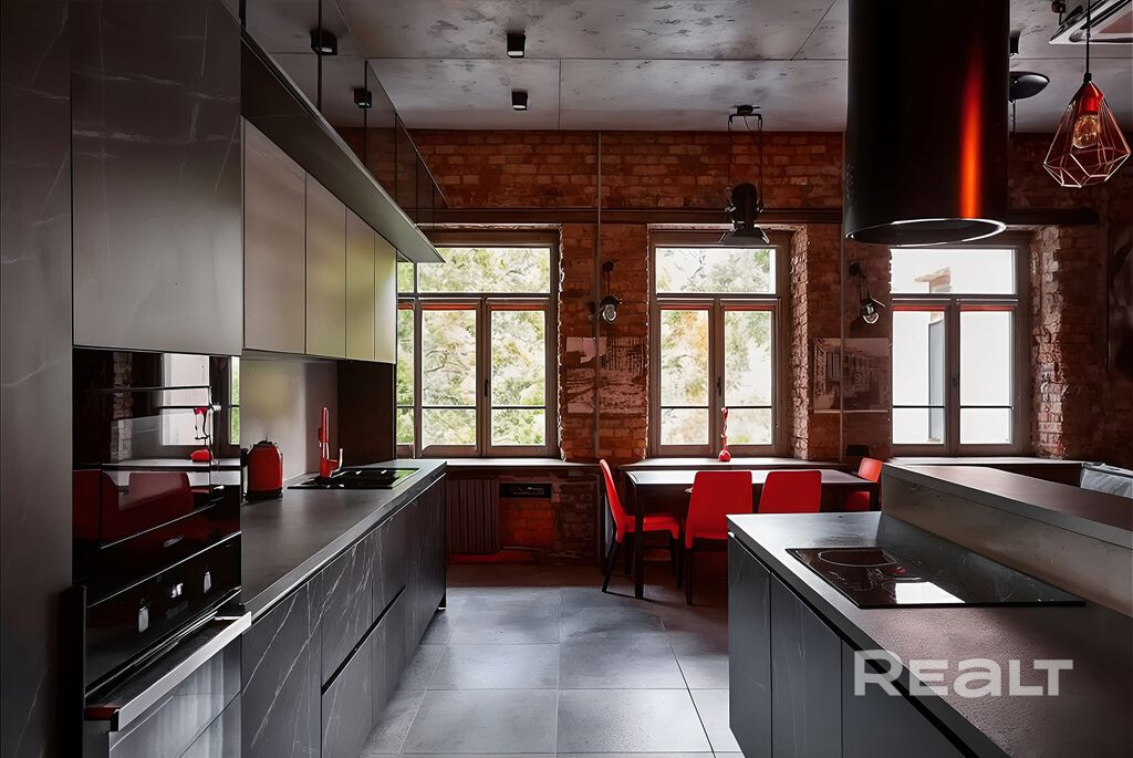 Квартира отличается своим интерьером — яркий современный лофт, который подчеркивают потолки высотой 3,5 метра и красные кирпичные стены. Кухня-гостиная обставлена хорошим кухонным гарнитуром с варочной поверхностью, духовым шкафом, вытяжкой и посудомоечной машиной. Также не стоит переживать из-за отключения горячей воды и жаркого лета, так как здесь установлены бойлер и кондиционер. В двушке имеются стиральная и сушильная машины.
