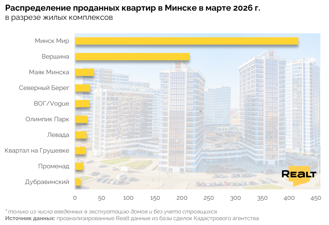 Кстати, среди участников рейтинга есть и неожиданный герой. 11-е место по итогам марта занял известный «проблемный» дом на ул. Академика Купревича, 16 — здесь было заключено 10 сделок.