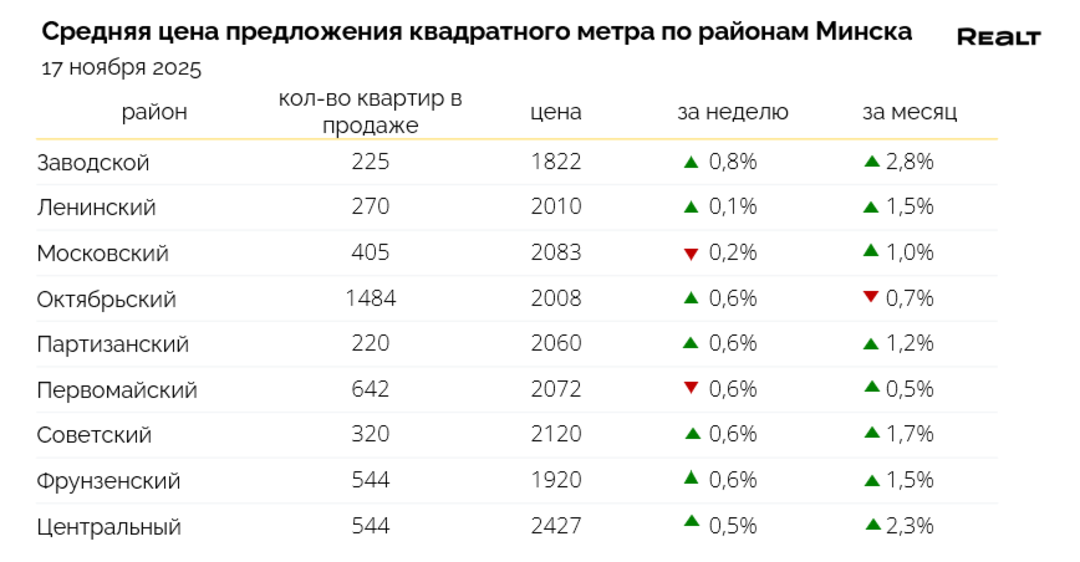Брест — 1151 $/м2 (+0.7%), Витебск — 903 $/м2 (без изменений), Гомель — 978 $/м2 (+0.3%), Гродно — 1073 $/м2 (+0.5%), Могилев — 1000 $/м2 (-1.8%).