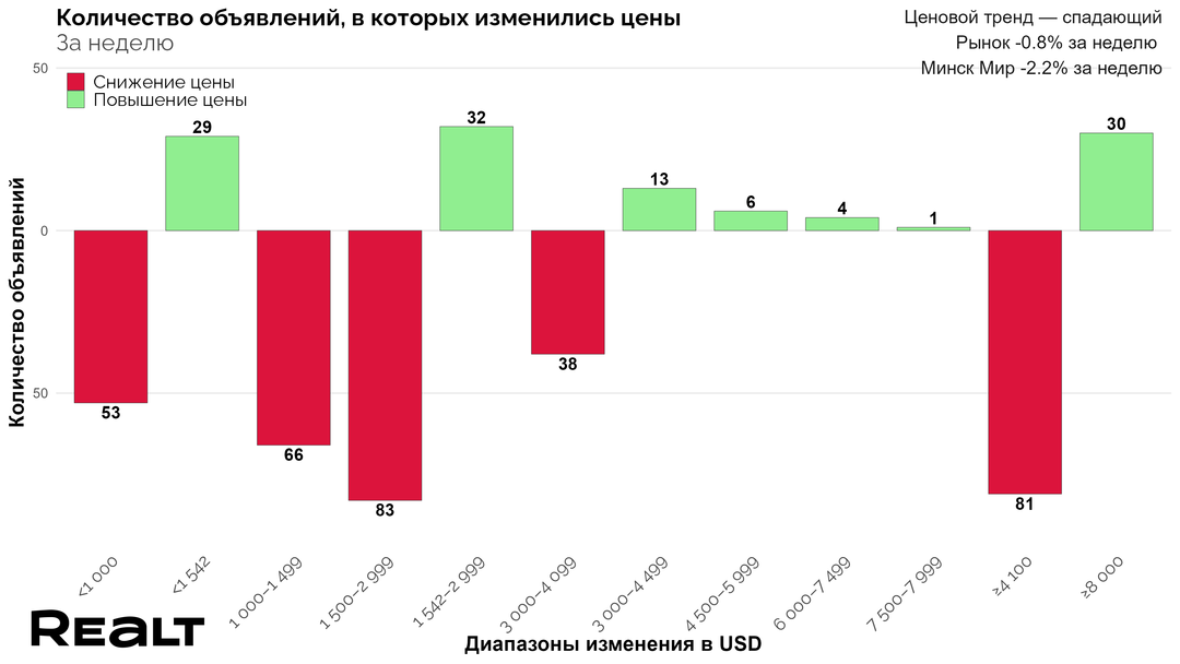 1694За последнюю неделю на вторичном рынке жилья Минска цены снова показали небольшой минус, а продажи квартир просели. Подробности и разбор причин — в аналитике Realt.