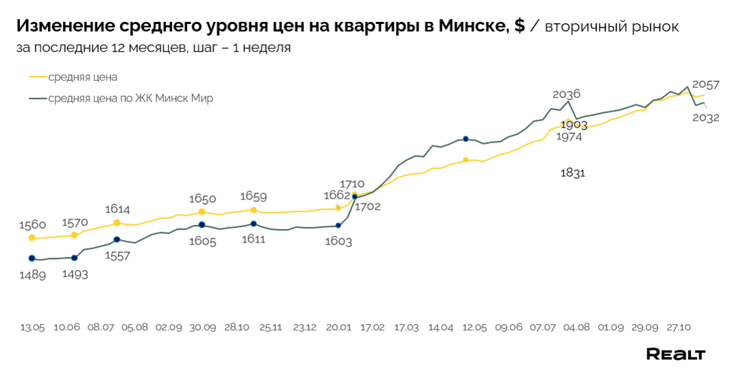 В результате, средняя стоимость квадрата по объявлениям в целом по Минску снизилась на 0,8% и находится на уровне 2039 $/м2. При этом в Минск-Мире цена квадрата показывает увеличение — за прошлую неделю на 0.5% до уровня 2060 $/м2.