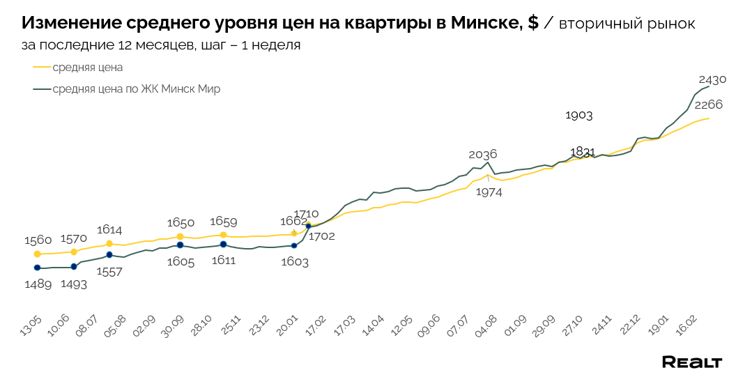 Понимая ваш интерес к квартирам в ЖК «Минск-Мир», теперь мы будем отслеживать динамику цен конкретно по этому комплексу.