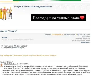 Хотелось бы выразить благодарность Наталье за оперативность, профессионализм и поддержку. Работа по продаже квартиры была выполнена на высоком уровне от момента первого контакта до заключения финальной сделки. Горячо рекомендую.