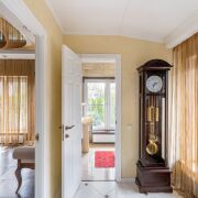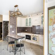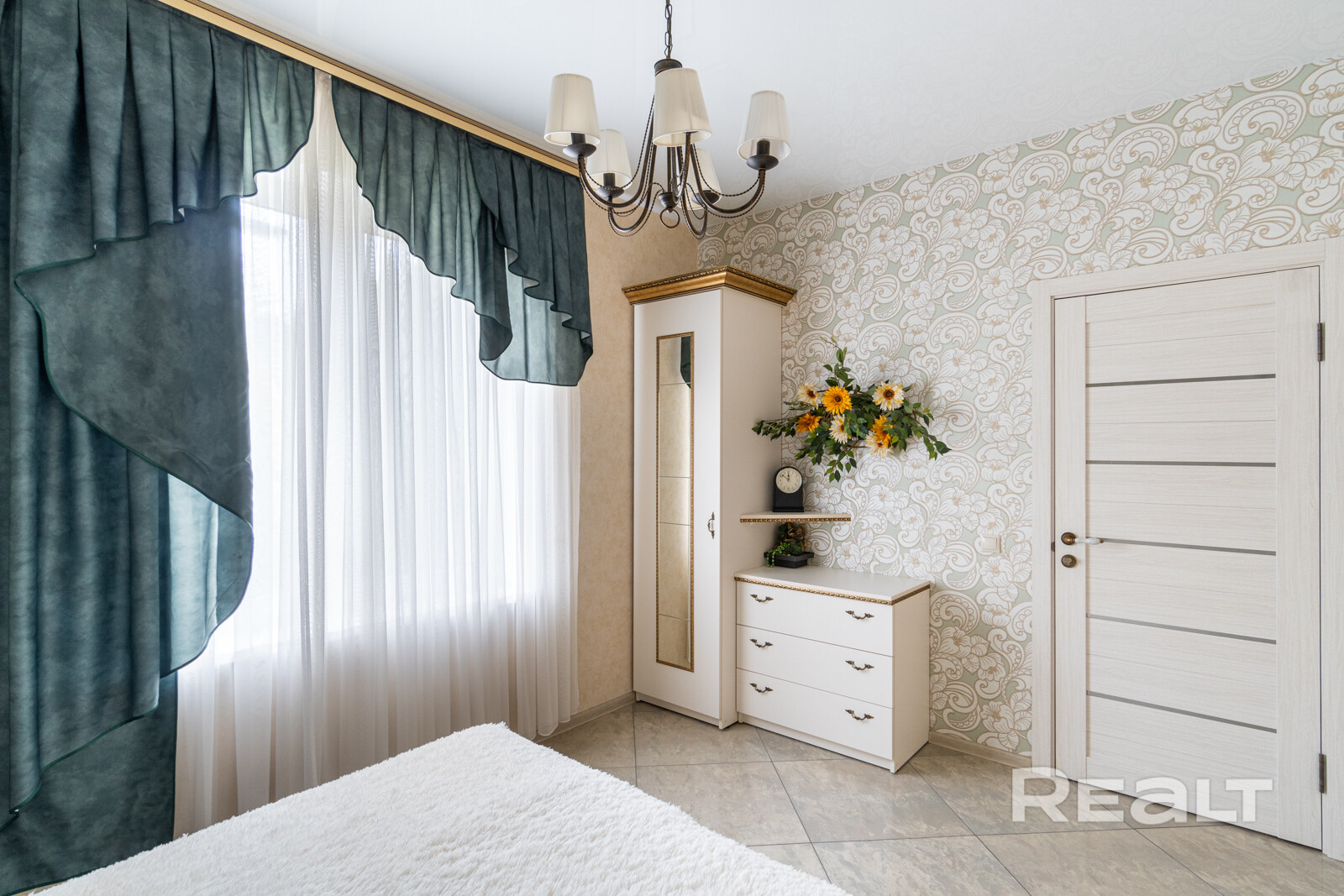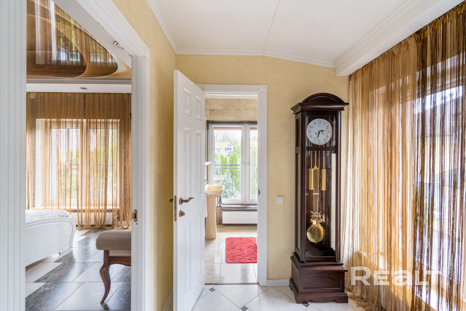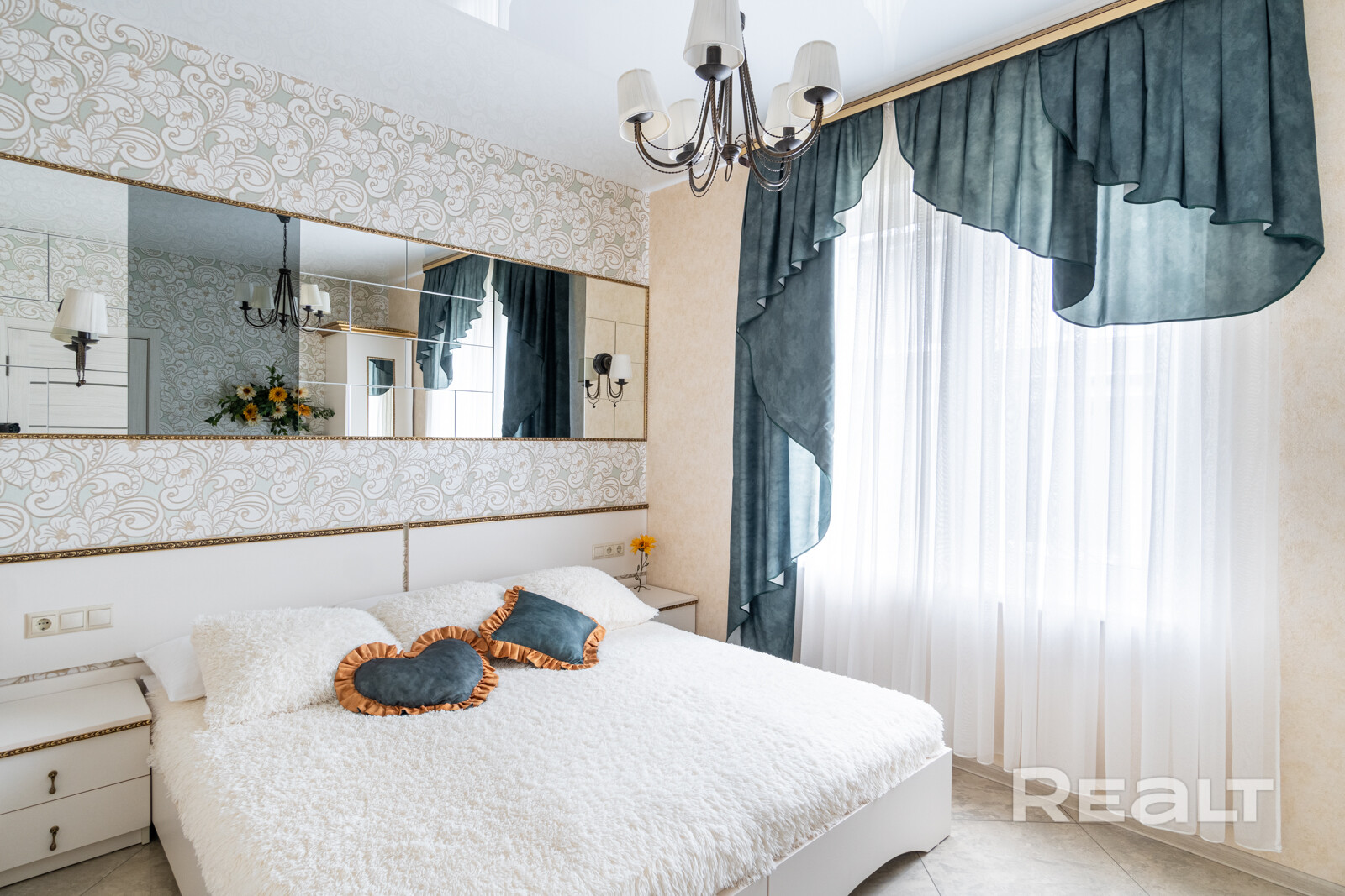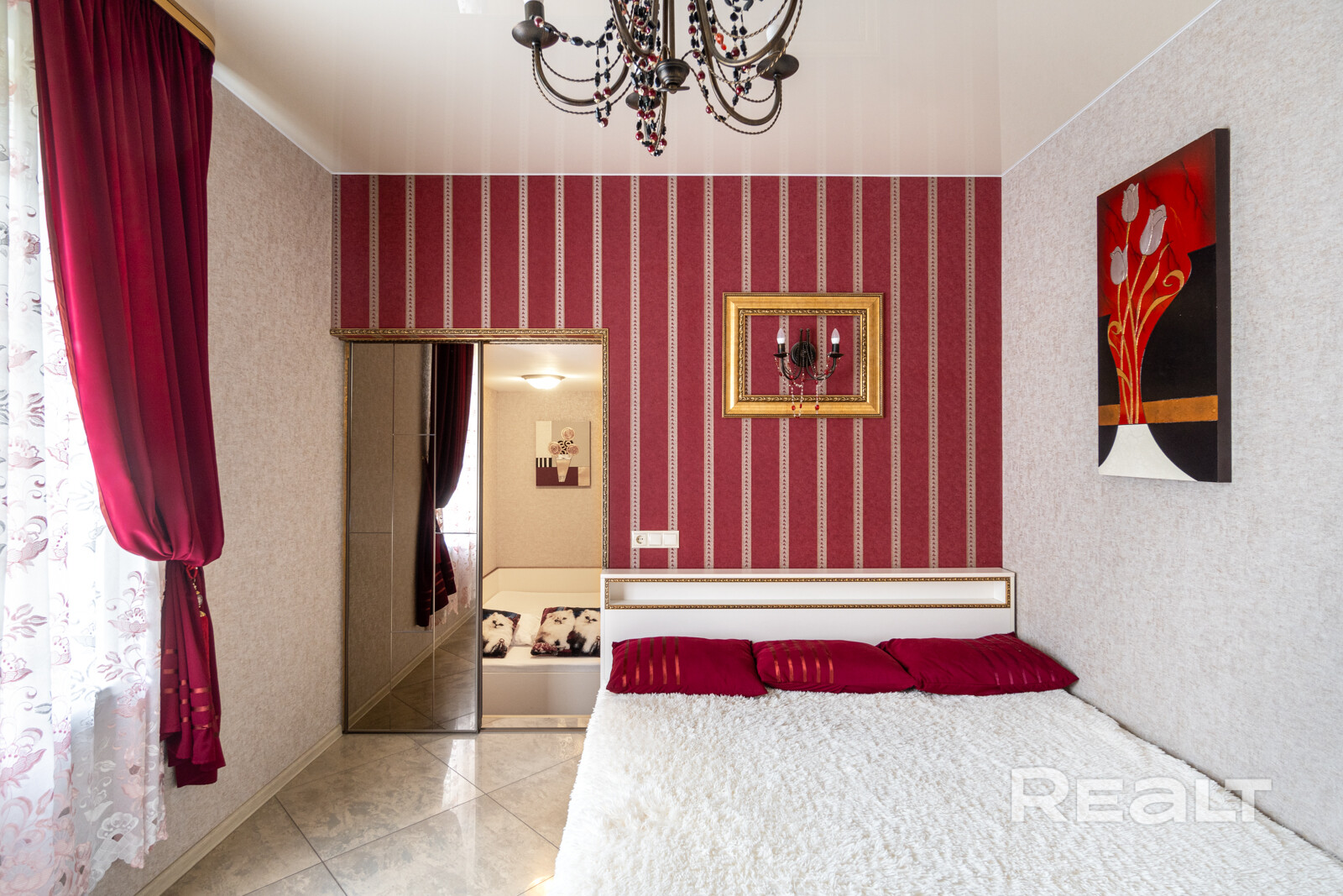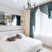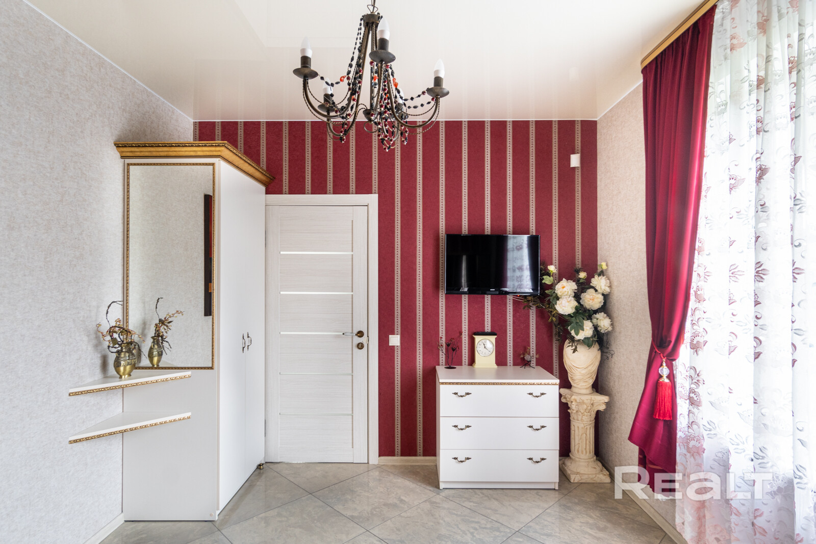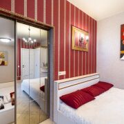 - «Романтика» — комната в большом доме дышит умиротворением и покоем. Приглушённые бордовые тона, зеркала, классическая полоска настраивают на романтический лад. А ещё здесь есть сюрприз: за зеркальной дверью расположена маленькая комната с полноценной двуспальной кроватью.