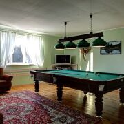 2 уровень: кухня с кухонным оборудованием (плита, посудомоечная и стиральные машины, печь СВЧ, холодильник, большой телевизор), столовая на 10/15 мест с выходом на террасу, где организована обеденная зона на свежем воздухе, бильярдная комната (бильярд на камне) и одна большая жилая комната.