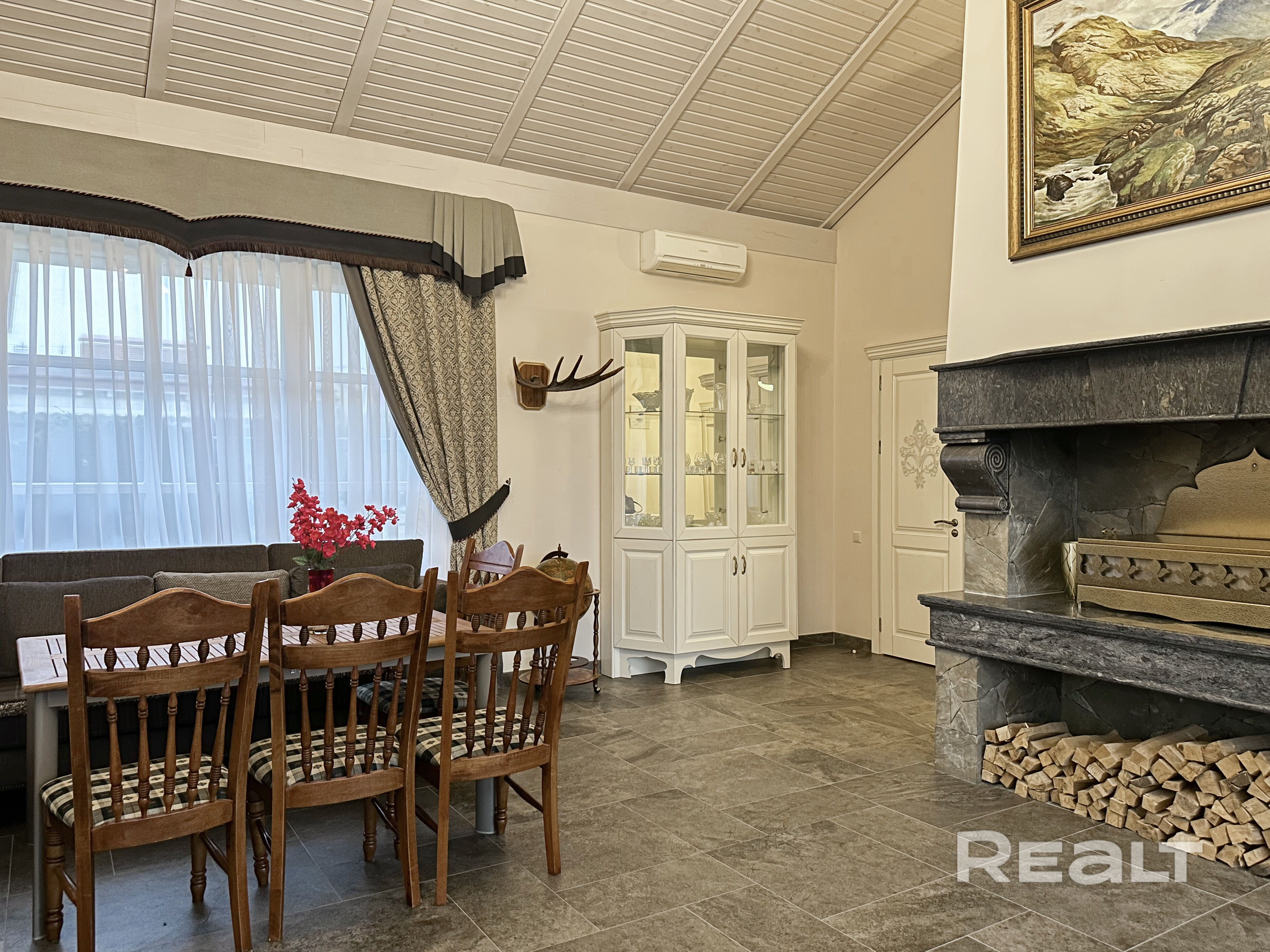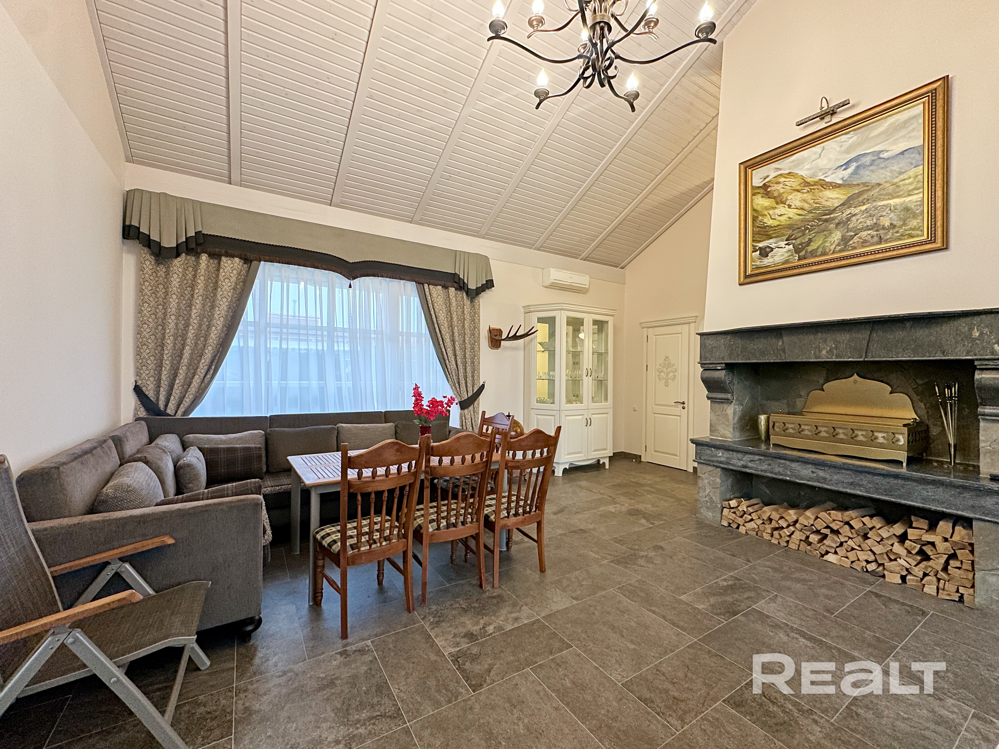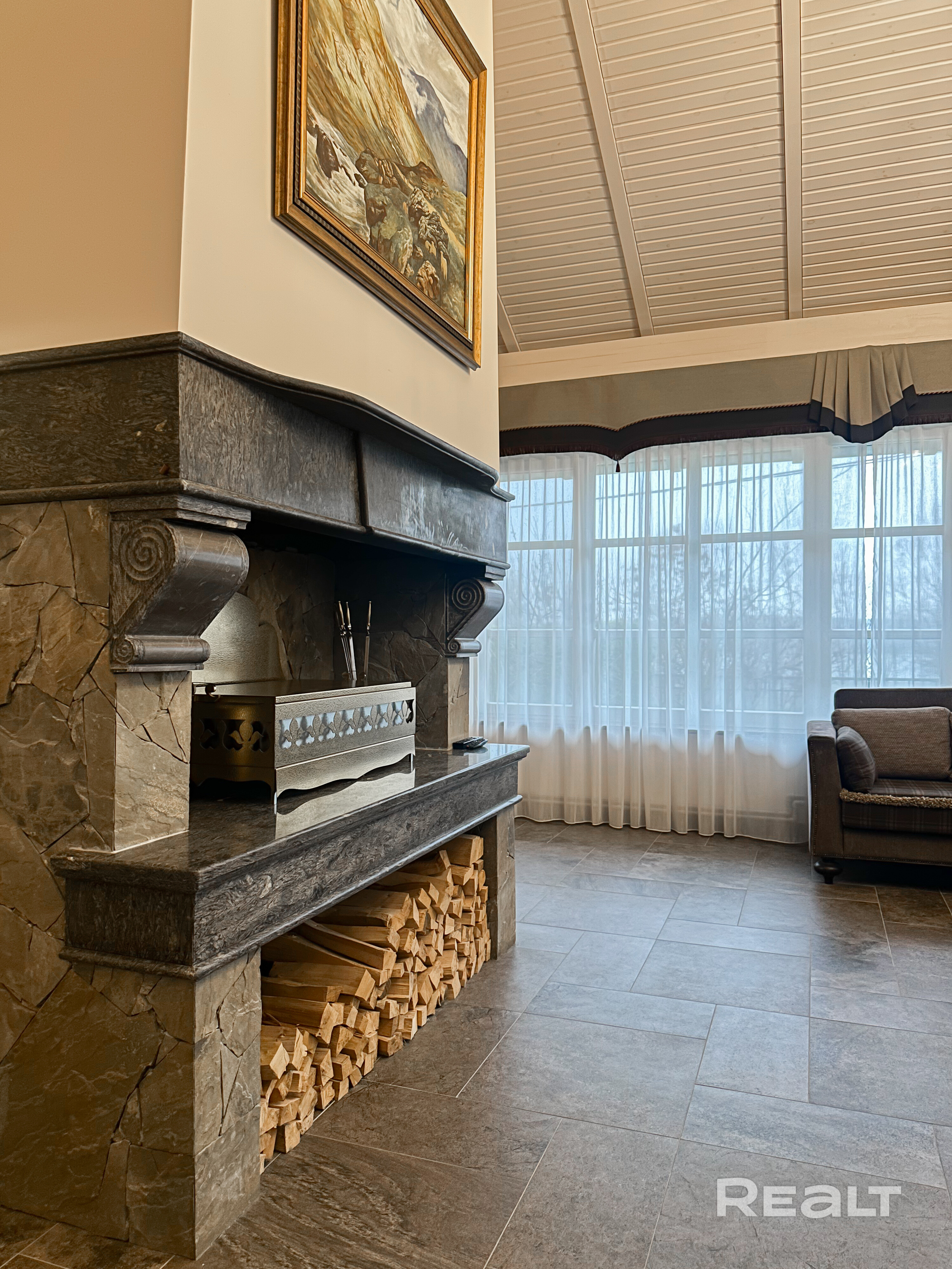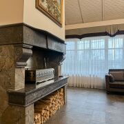 - Большая гостиная 44,8 м2 с камином, отделанным натуральным камнем