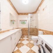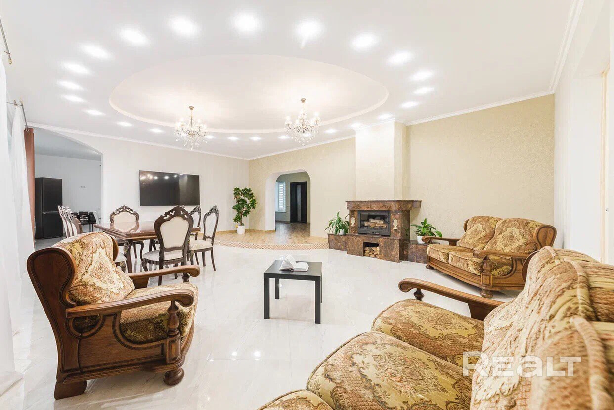 Дом двухэтажный с цоколем. На первом этаже просторная гостиная с камином составляют единое пространство с кухней. Есть спальня, большой санузел с душевой кабиной.
