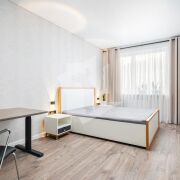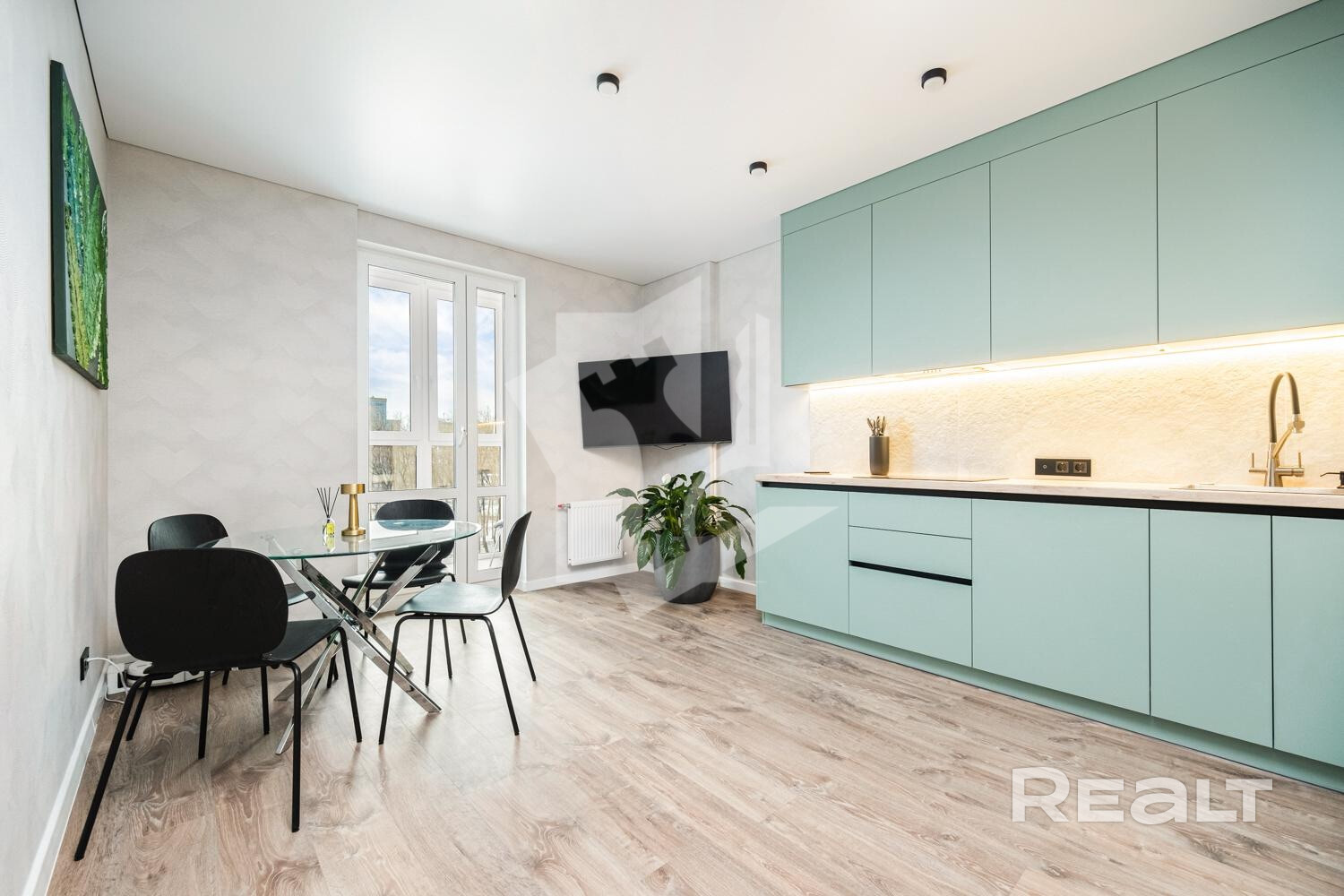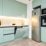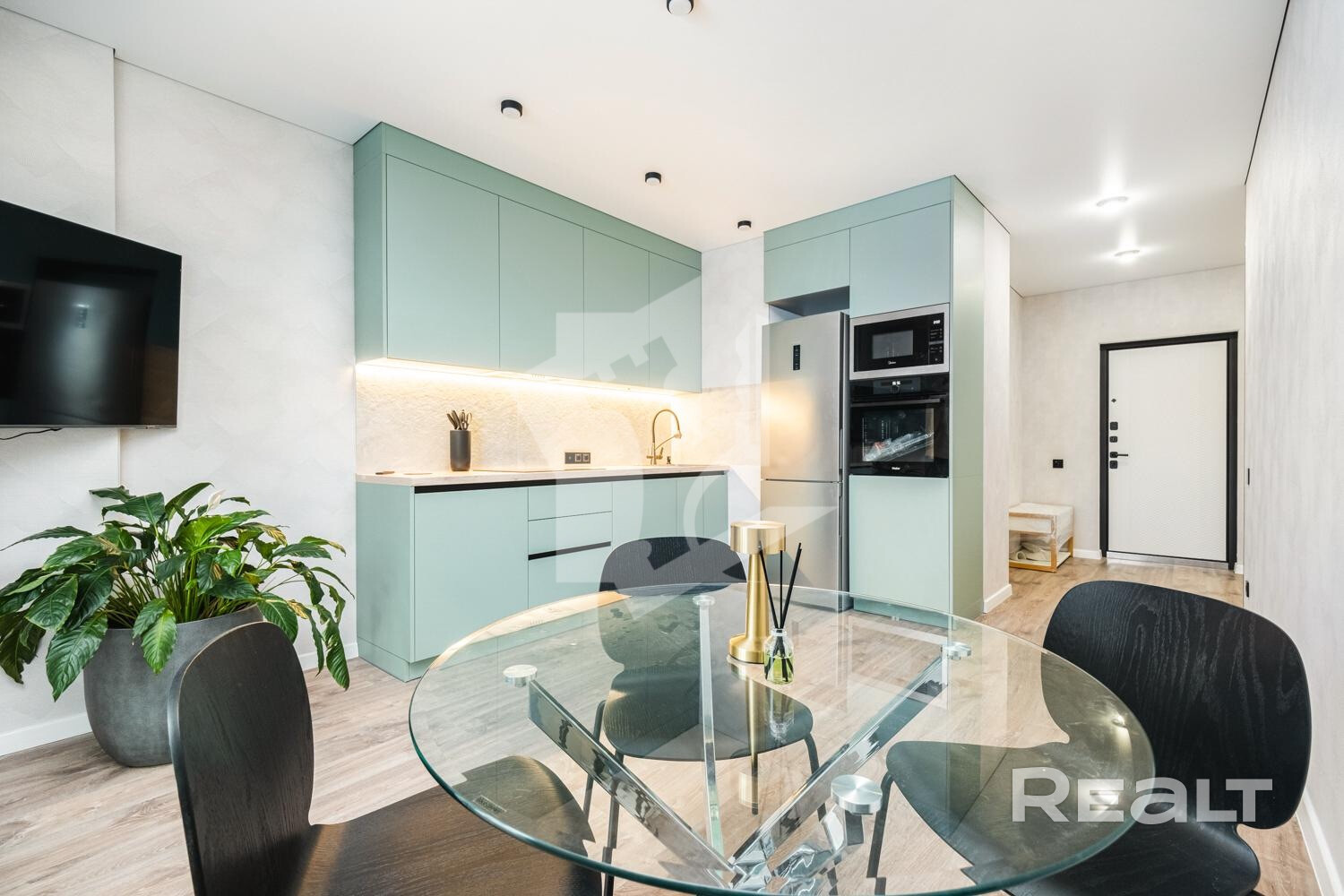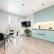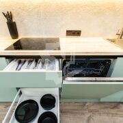 Современная кухня оборудована встроенной бытовой техникой ведущих европейских брендов: духовой шкаф, микроволновая печь, варочная панель, вытяжка, посудомоечная машина, холодильник, 2 телевизора, стиральная машина.