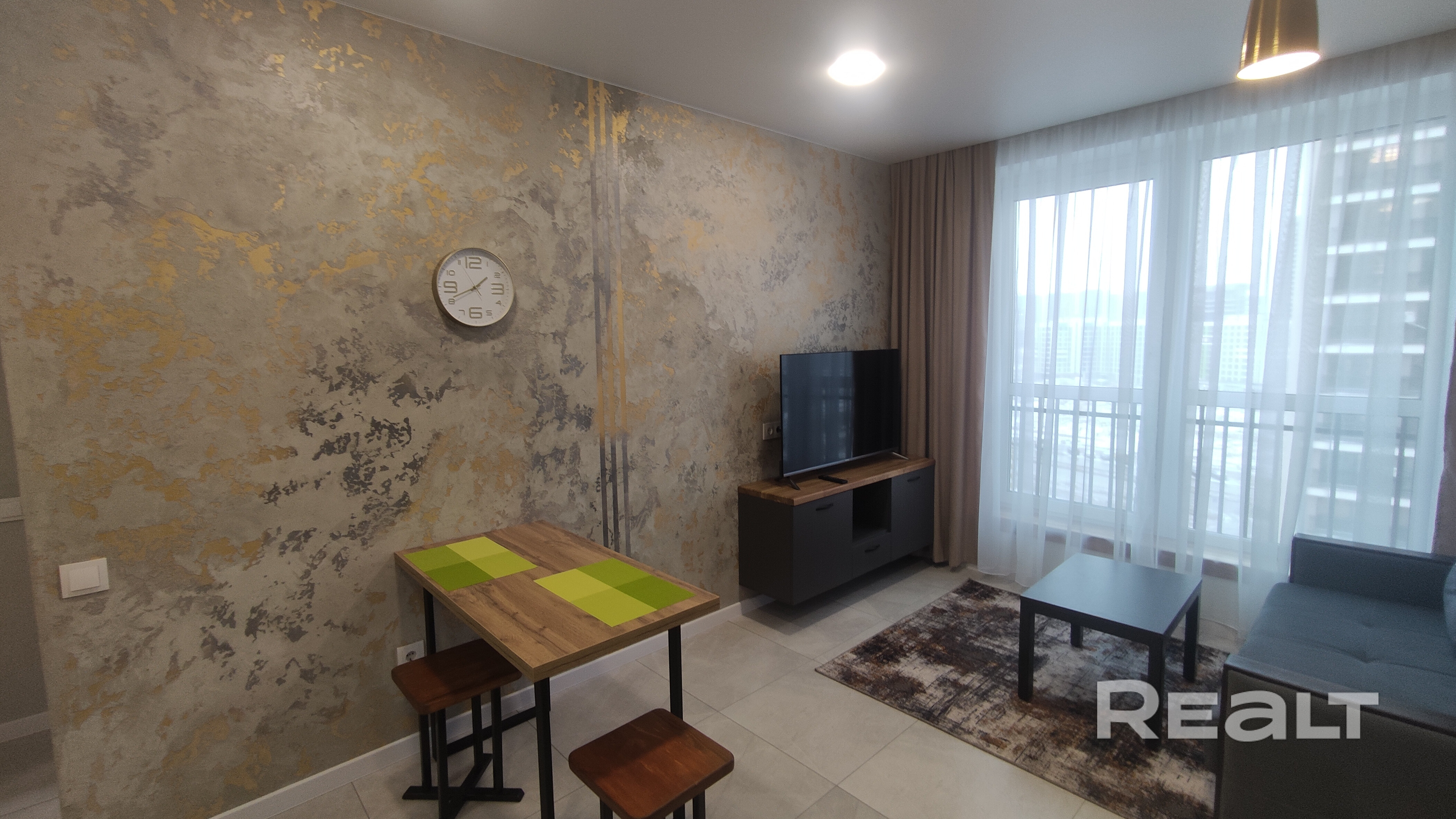 Сдается стильная, уютная квартира в ЖК Минск Мир,евродвушка, 38 м на длительный срок. Собственник. Укомплектована всей необходимой мебелью и техникой( индукционная плита, духовой шкаф, электрочайник, микроволновка, вытяжка, холодильник , стиральная машина, пылесос, телевизоры, интернет, кондиционер). Застеклённая лоджия 4 кв. У дома остановка 4 маршрутов автобусов, в том числе и N100. Автомобильная парковка. Метро: ст. Аэродромная - 9мин. от дома, Оплата за месяц , залог, коммуналка, интернет