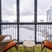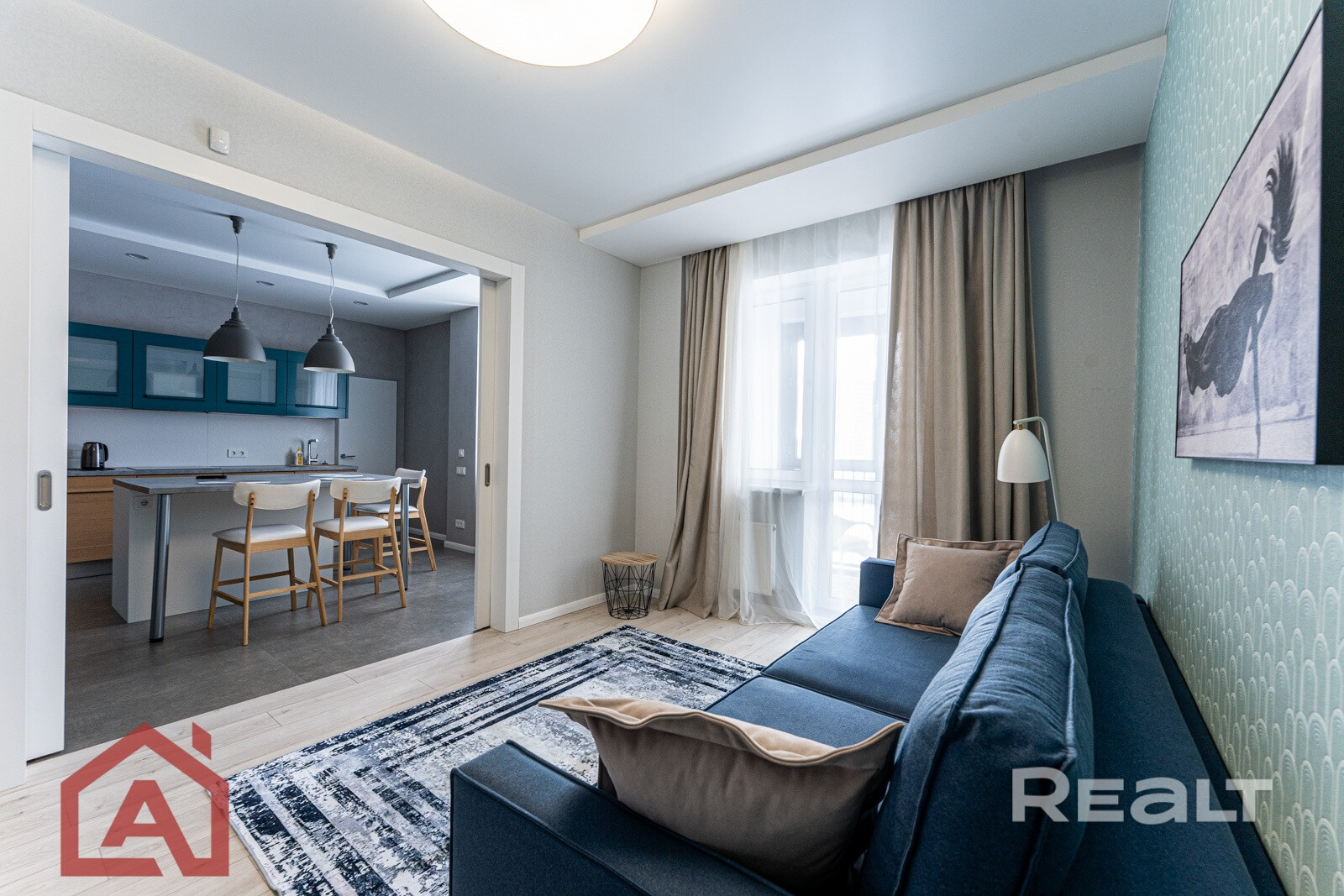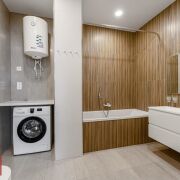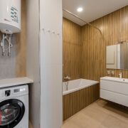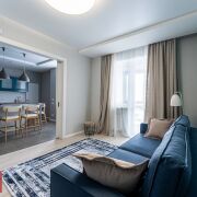 На 73-х квадратов расположились : кухня-гостиная, 2 жилые комнаты (одна из которых мастер-спальня), лоджия. В квартире 2 полноценных санузла , есть и ванна и душевая кабина.